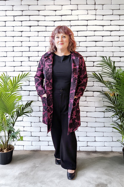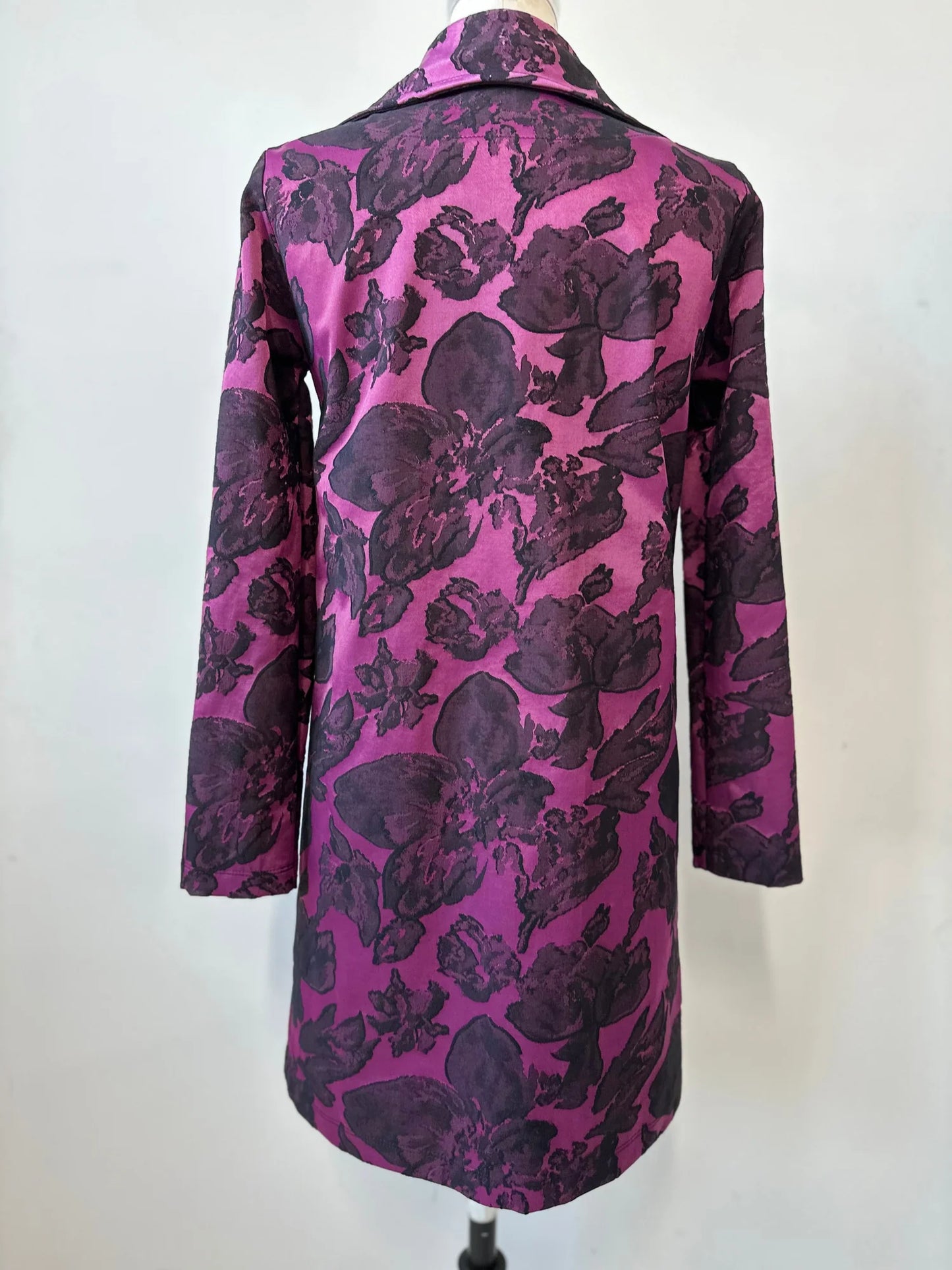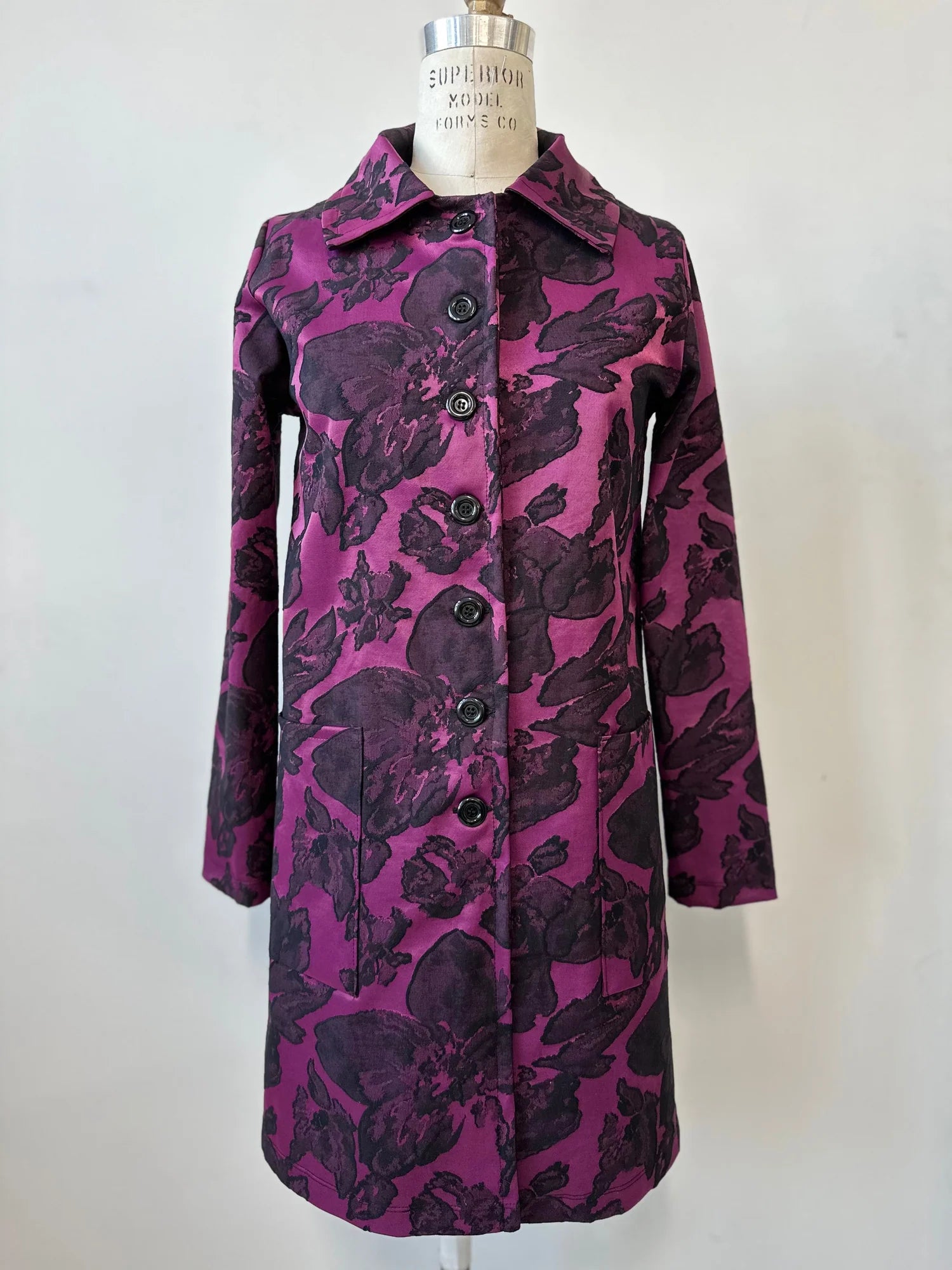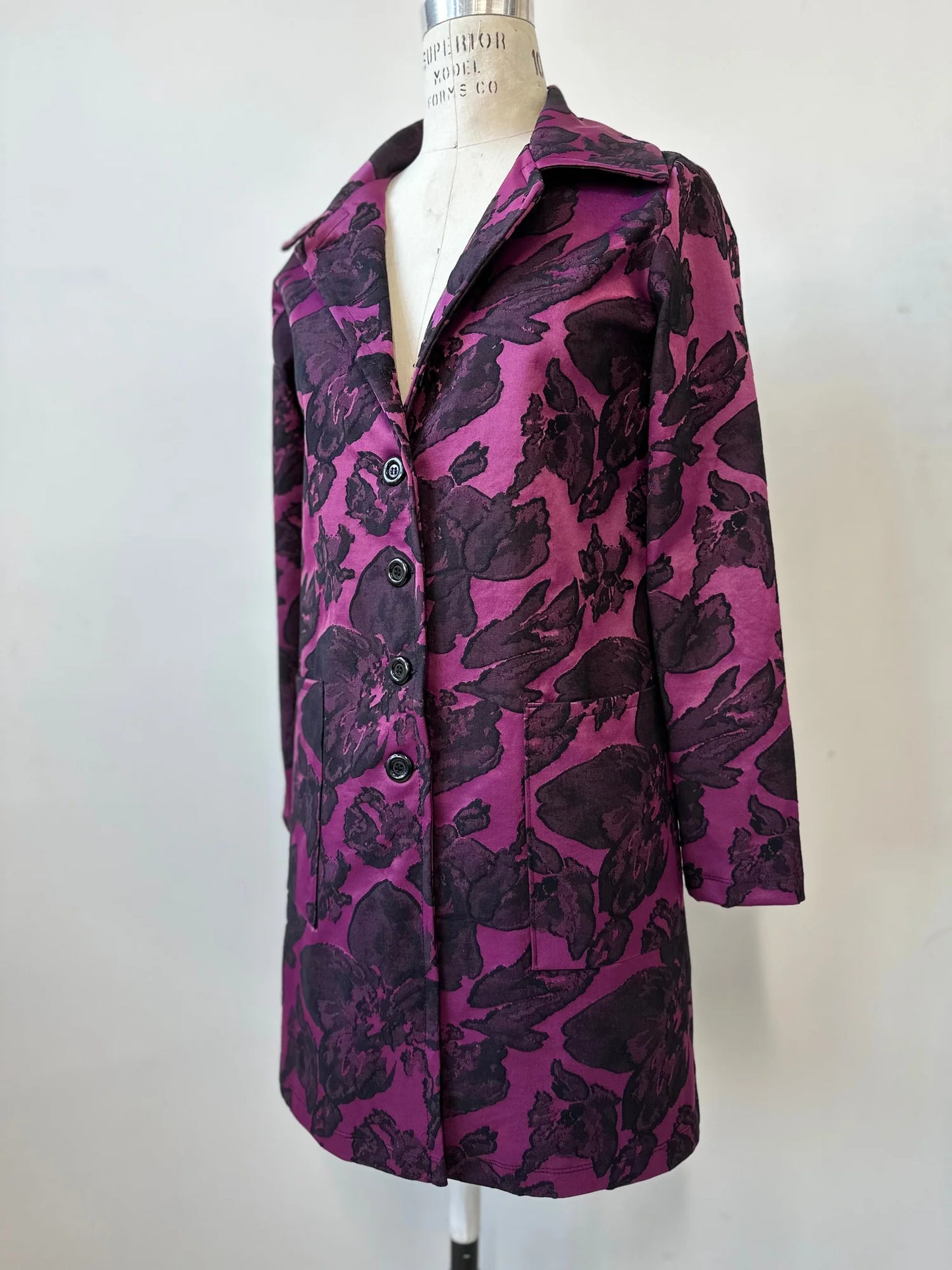 Behold the beauty of the Amarante Coat from Kollontai. This straight cut coat is adorned with an intricate floral pattern on Blackberry coloured satin. It buttons down the front, and has large pockets. The hem falls just above the knees. Available in sizes XS to XL.