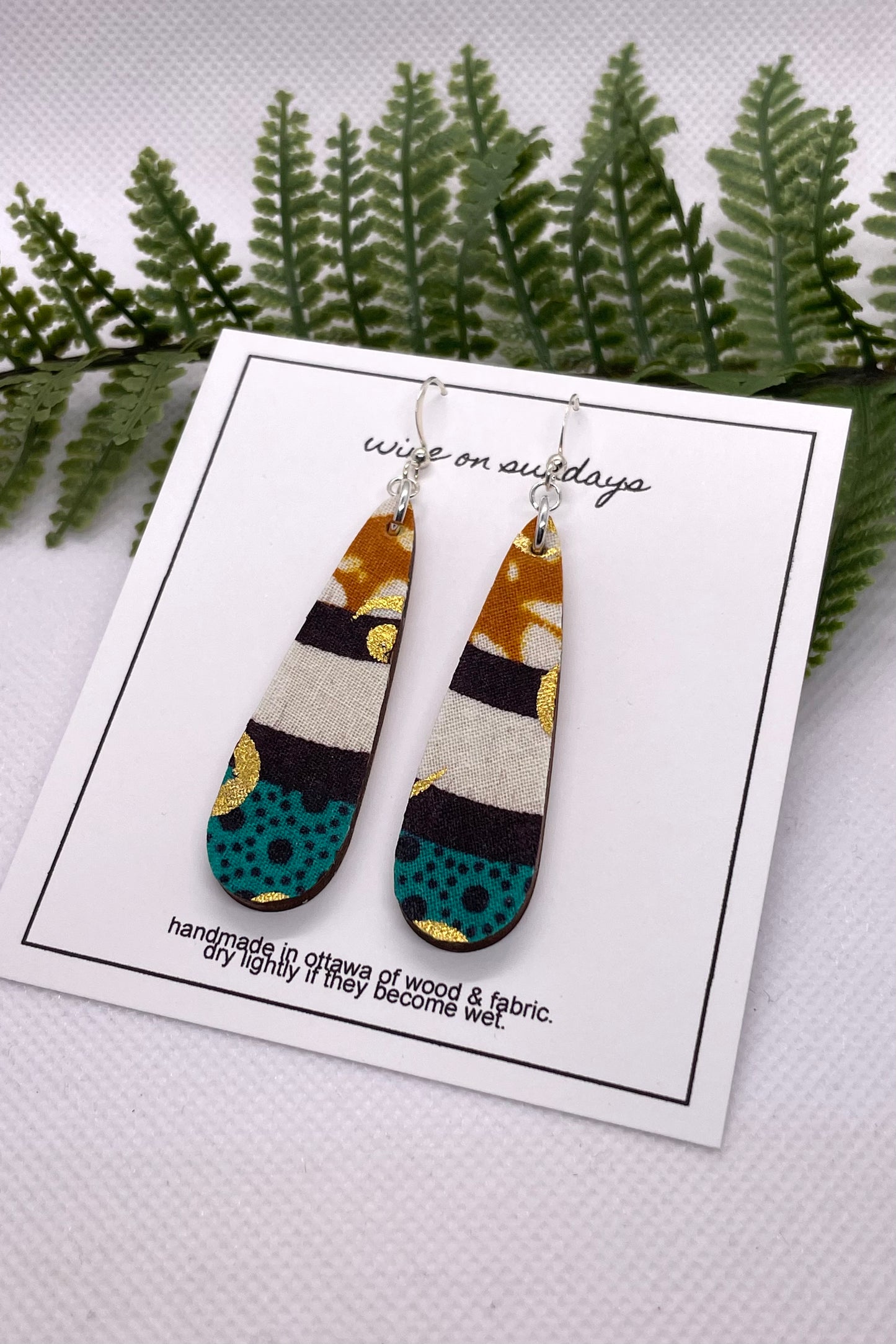 These earrings were lovingly made in Ottawa of fabric and wood. Each pair is unique. 😊