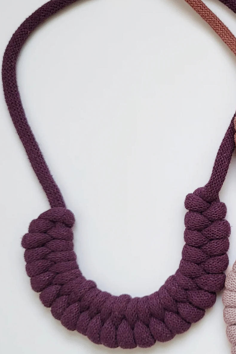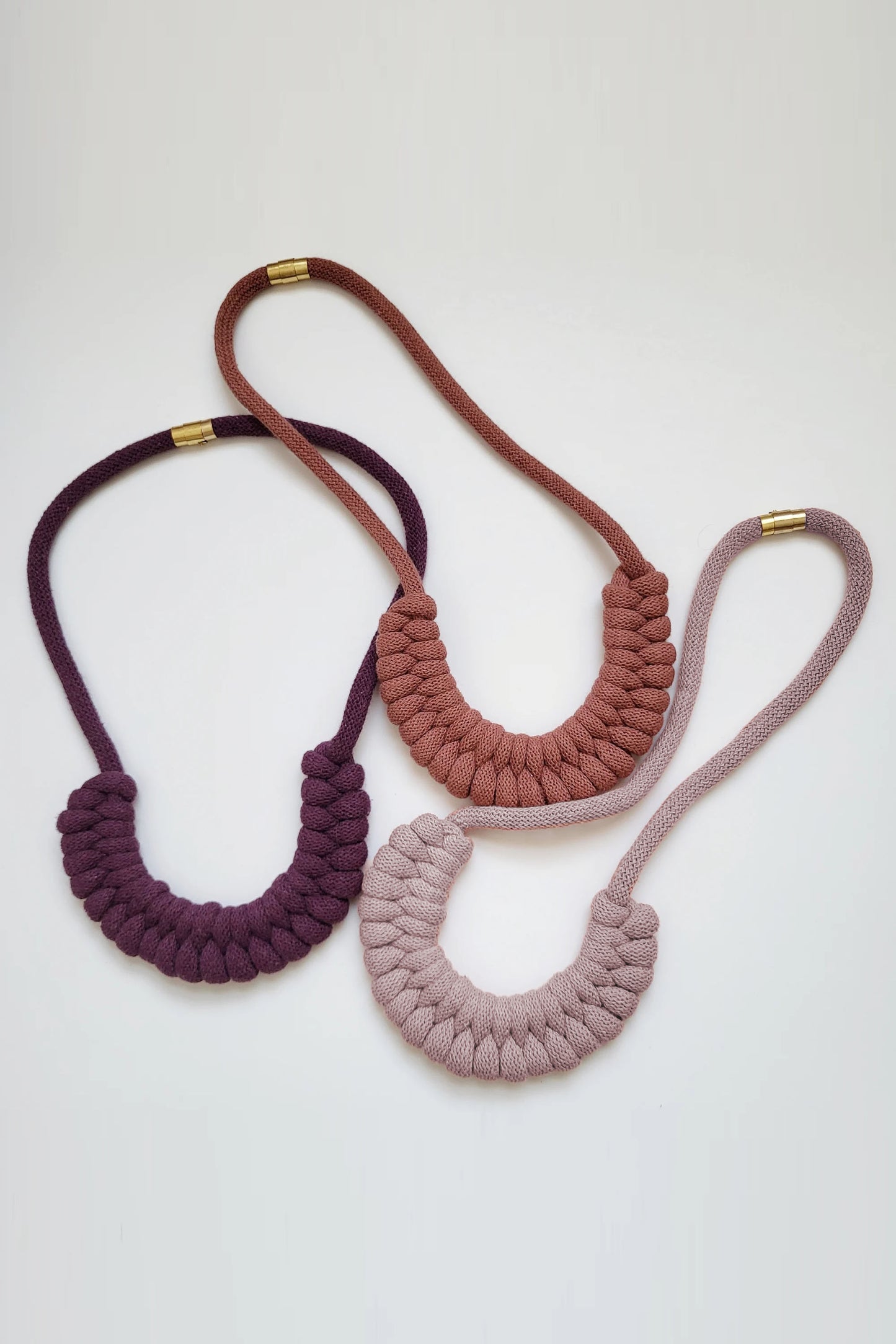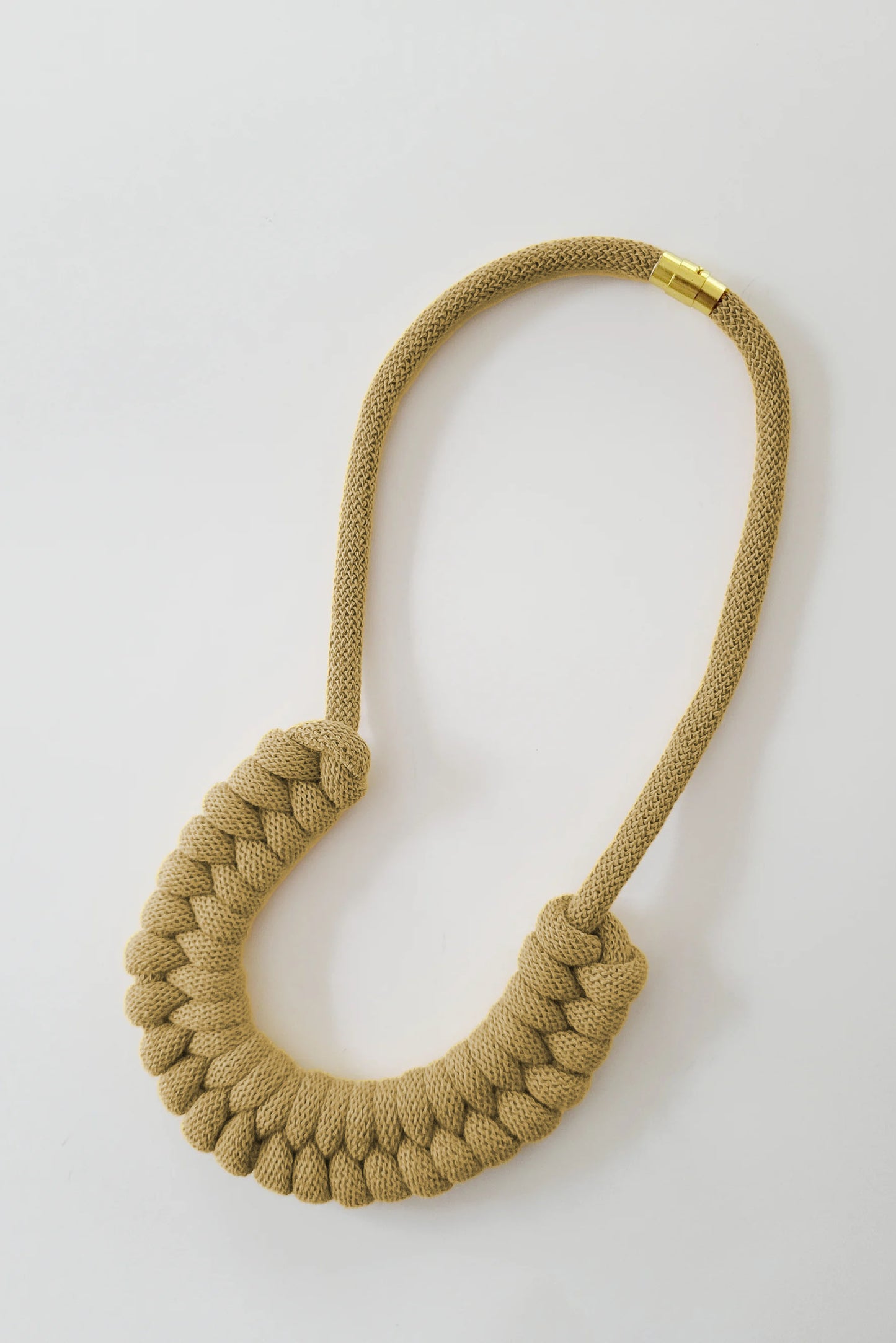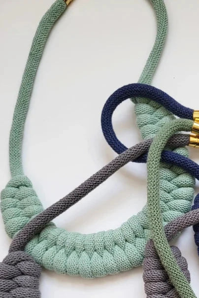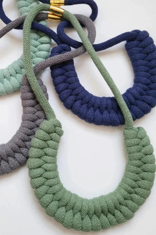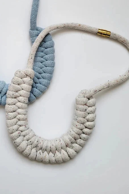 The Aspen necklace is made from soft cotton rope using the figure eight knot. It has an inner circumference of approximately 50cm and has a gold-plated magnetic tube clasp to open and close. This necklace can be carefully spot cleaned but please ensure the clasp does not get wet.
