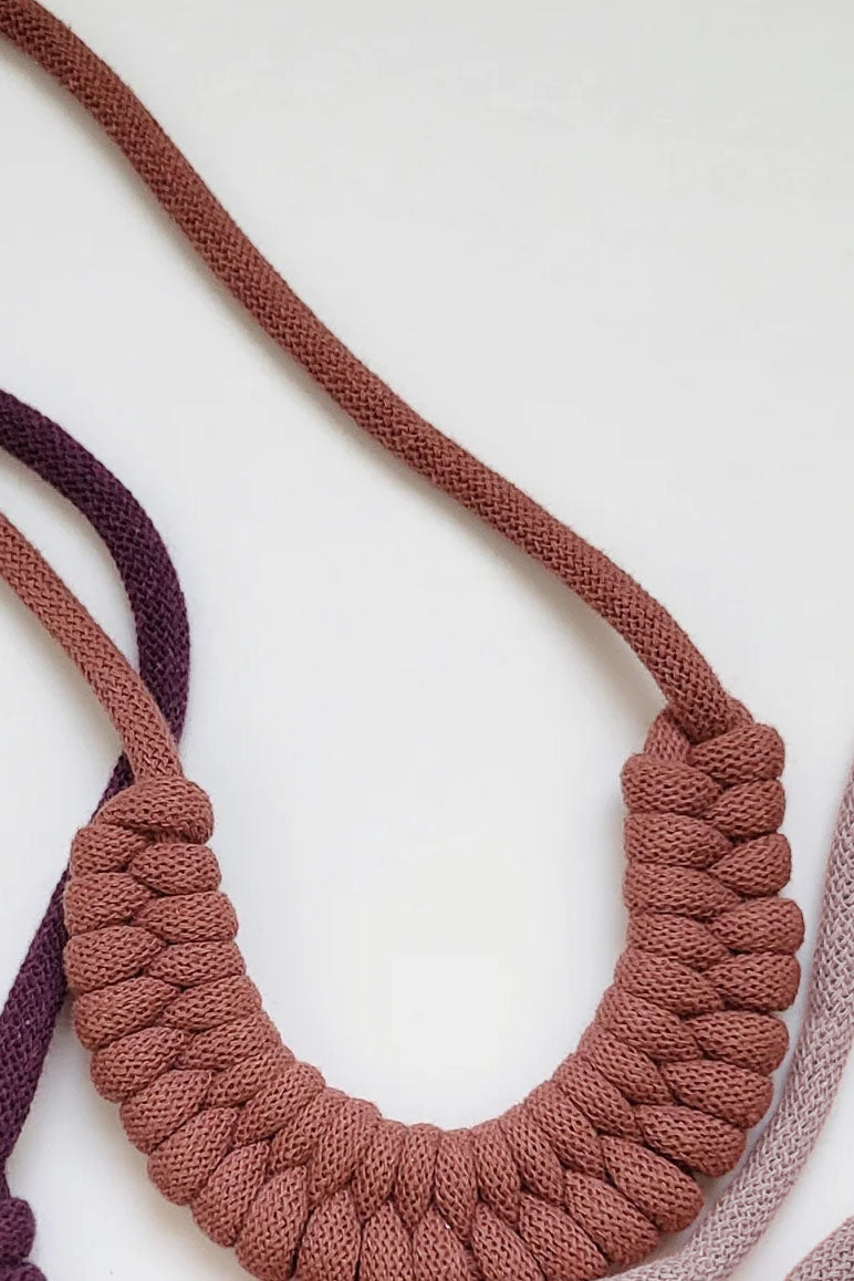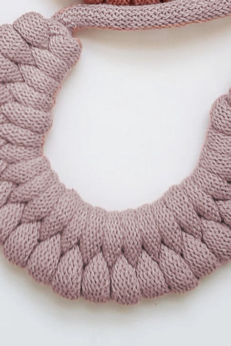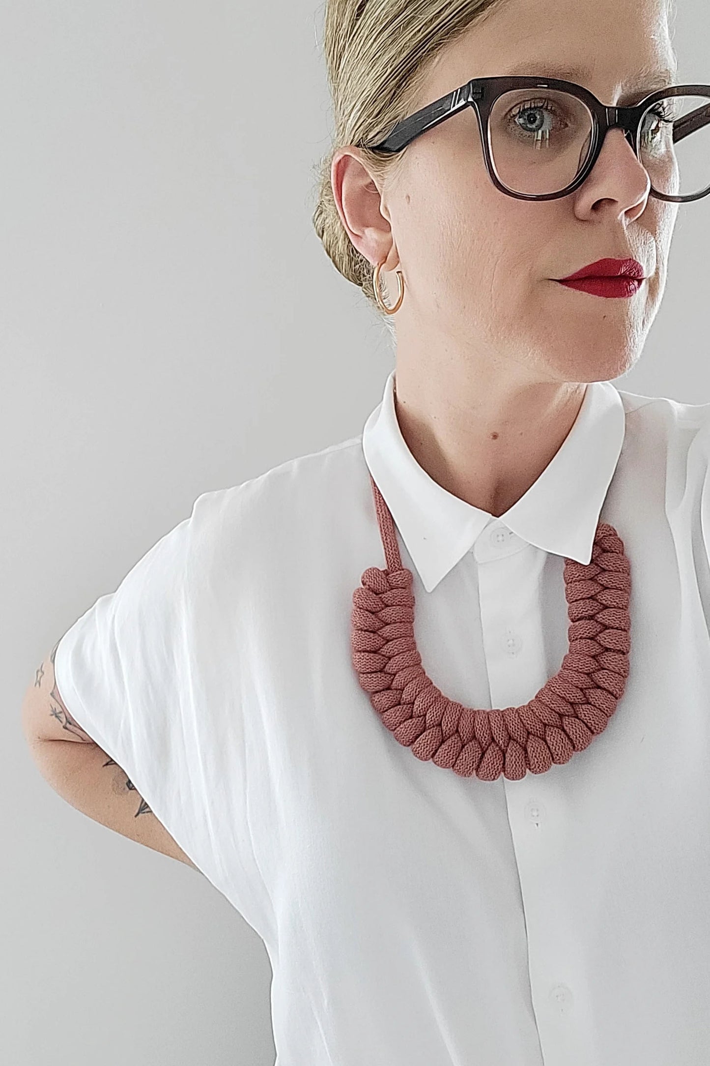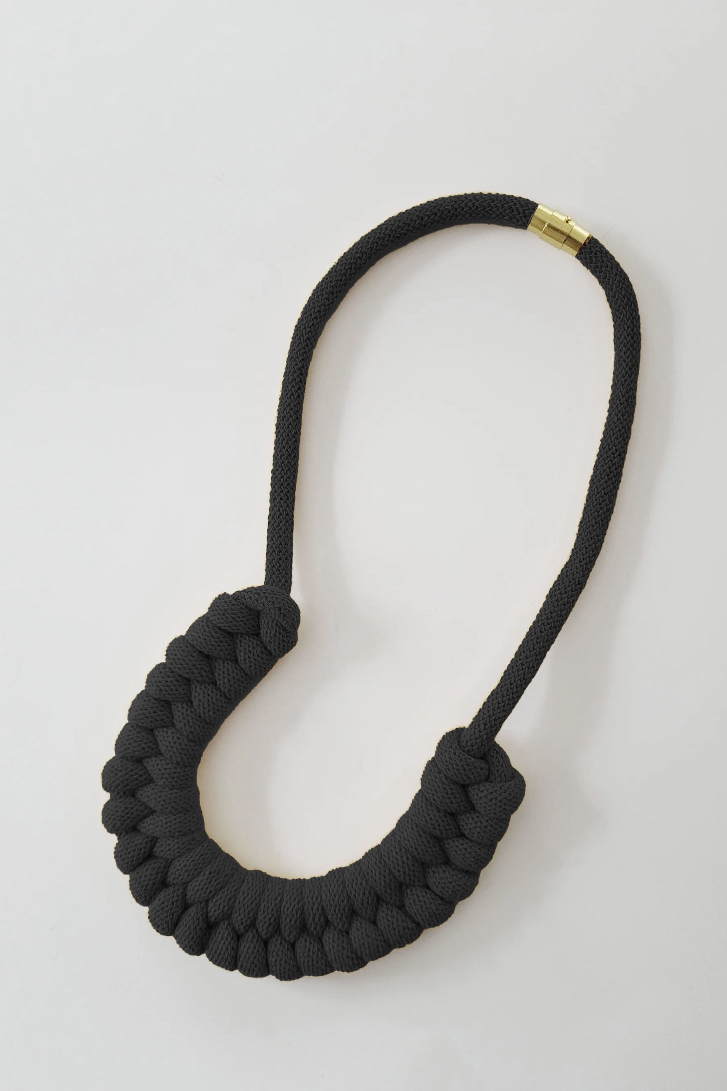 The Aspen necklace is made from soft cotton rope using the figure eight knot. It has an inner circumference of approximately 50cm and has a gold-plated magnetic tube clasp to open and close. This necklace can be carefully spot cleaned but please ensure the clasp does not get wet.