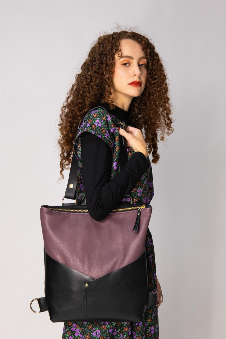 The shoulder straps are easily adjustable, and can also be transformed into one shoulder strap for an 'over the shoulder' look. The main compartment closes with a zipper, and is lined with a waterproof fabric. It has an inside and outside pocket, and has a larger compartment inside.