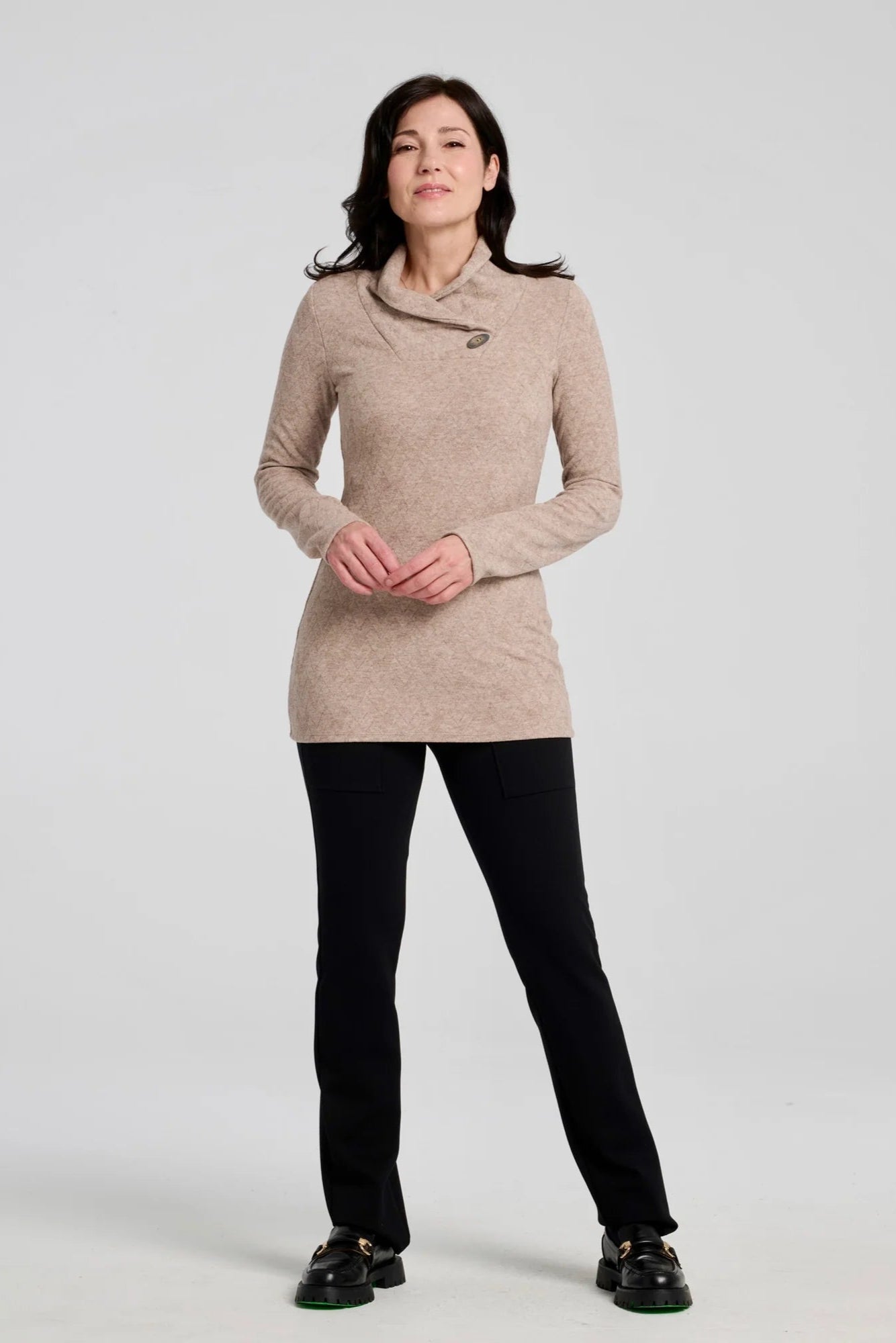 These Bari pants by Kollontai are a new go-to essential. Crafted from thick, stretchy fabric, they offer a sleek slim fit with a comfy wide pull-on waistband. Plus, large front patch pockets! They come in Black and Granny Smith in sizes XS to XL.
