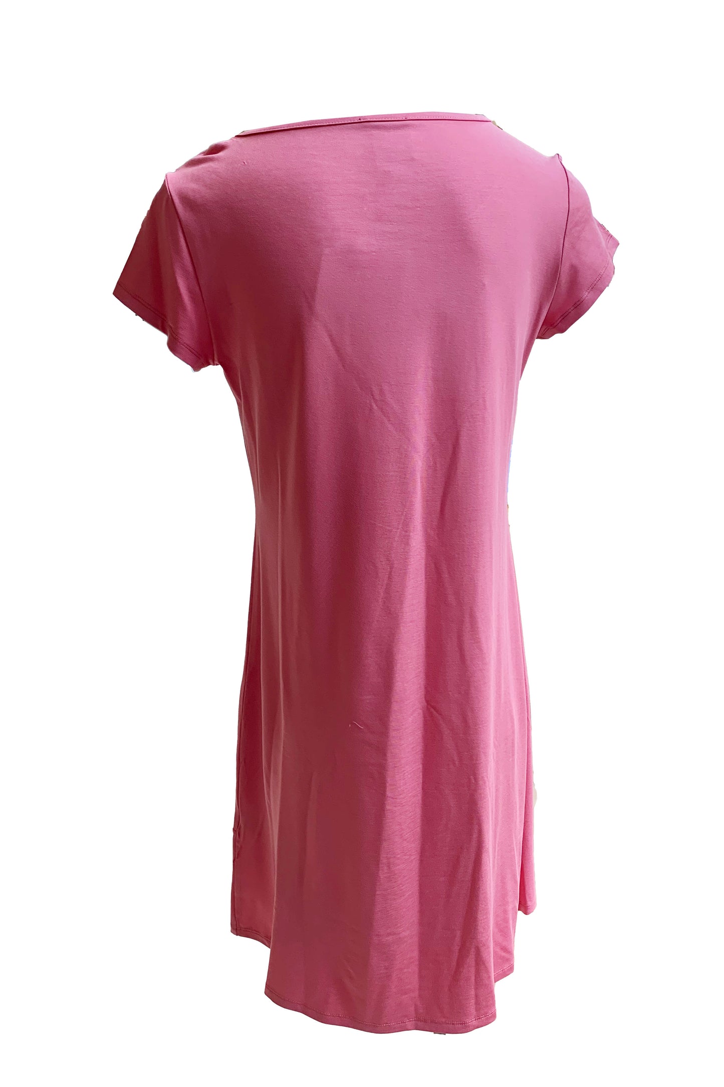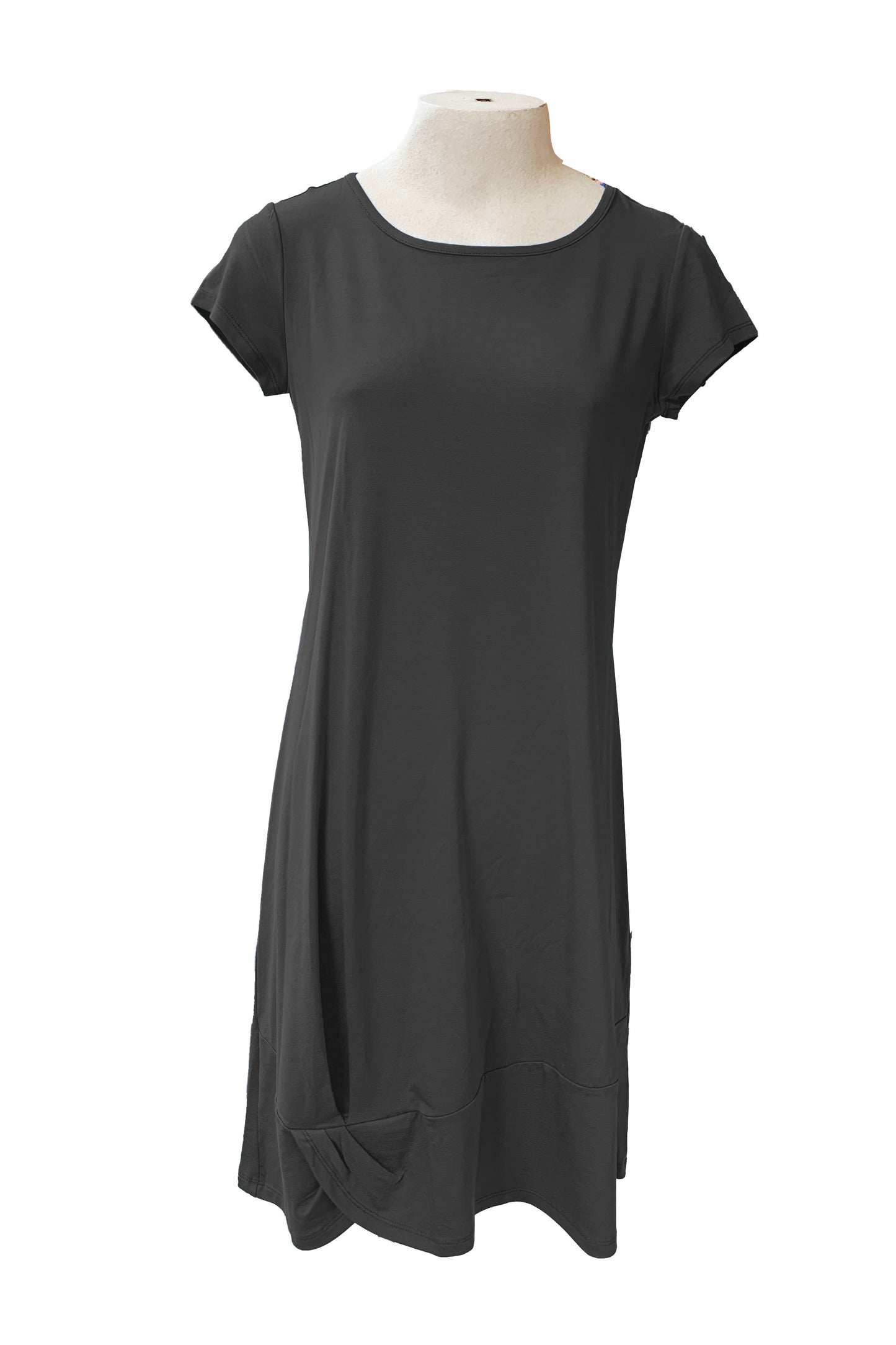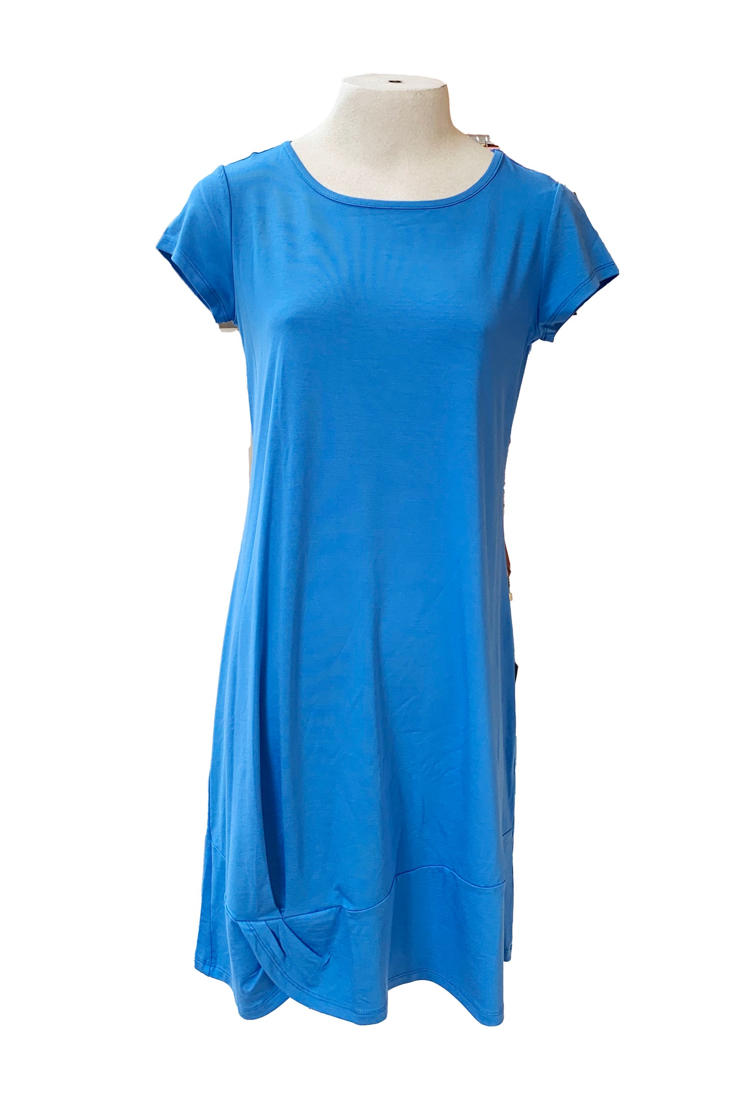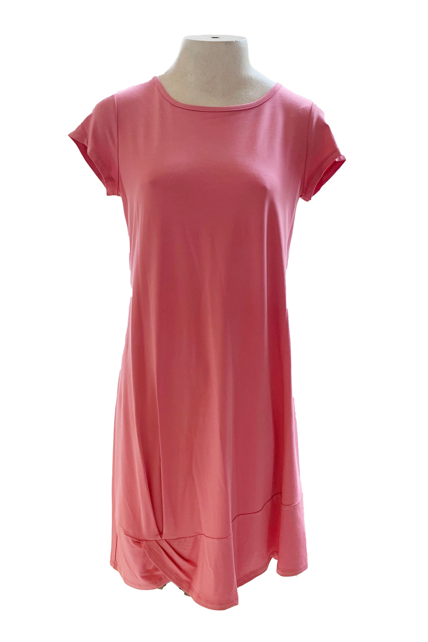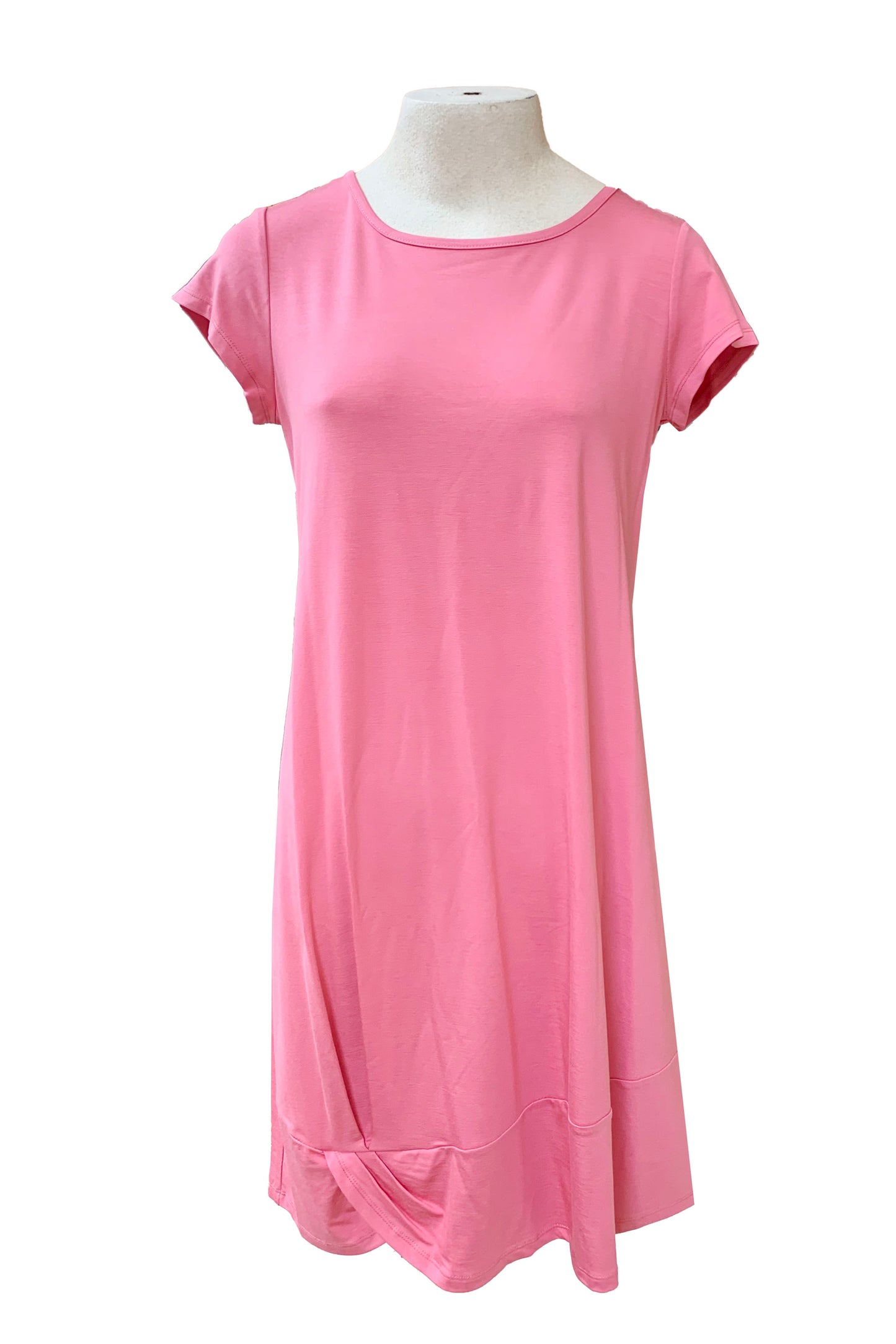 Introducing the one-of-a-kind Catreena Dress by Pure Essence. This t-shirt dress is not your average piece, featuring a twist pleat and a unique tulip hem detail at the bottom. With a loose fit, short sleeves, and a round neck, it's perfect for any casual occasion. Made from eco-friendly bamboo rayon, it comes in three stunning shades - Mykonos, Sorbet, or Black - and is available in sizes XS to XXL.