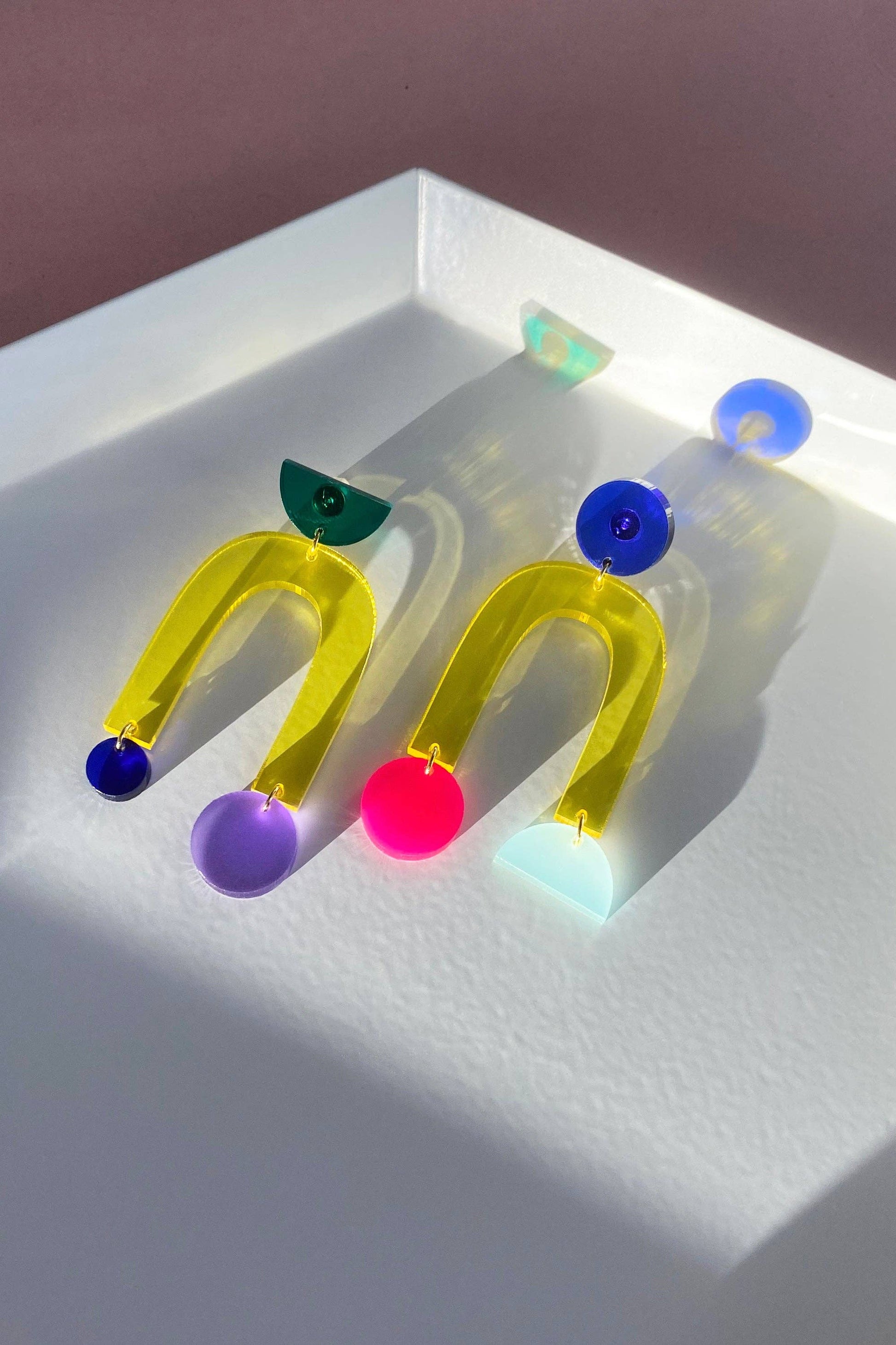A re-release of the original "Collage" earrings from the archives. Selected as a 2021 Etsy Design Awards Finalist and featured in Elle Canada & Pop Sugar - the “Collage” earrings are one of Combinist's most popular styles. A playful mix of shapes, colours and transparencies.