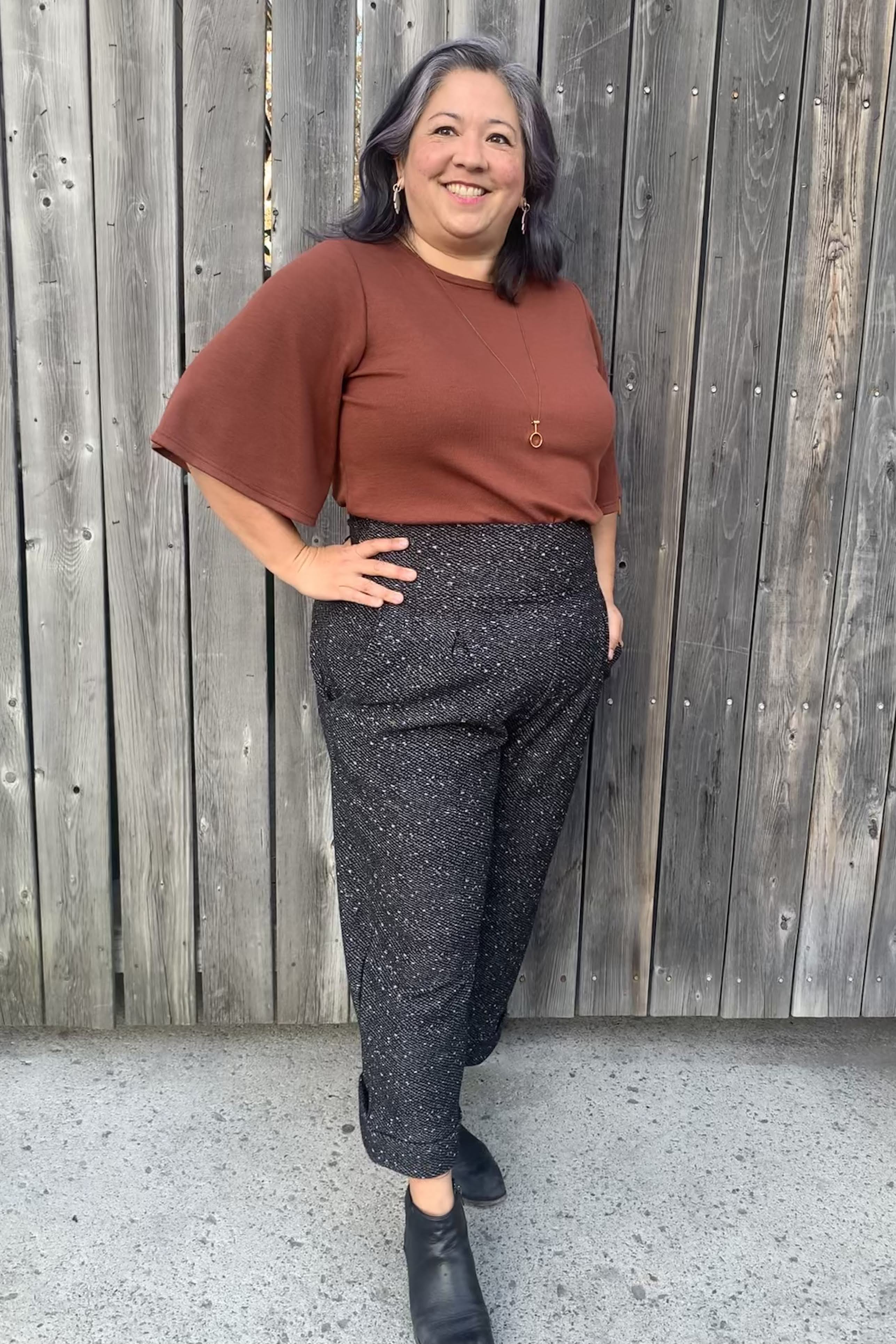 Melow's Dorian pants are bestsellers for a reason – they look amazing on everyone! The Dorian is a high-waisted jersey pant with a wide, 3/4 length capri leg. These trouser have front darts and a folded hem and look awesome with ankle boots or high boots. They come in three gorgeous imitation tweed knits: Pesto Tweed, Grape Tweed and Black Tweed. Available in sizes XS to XXL.