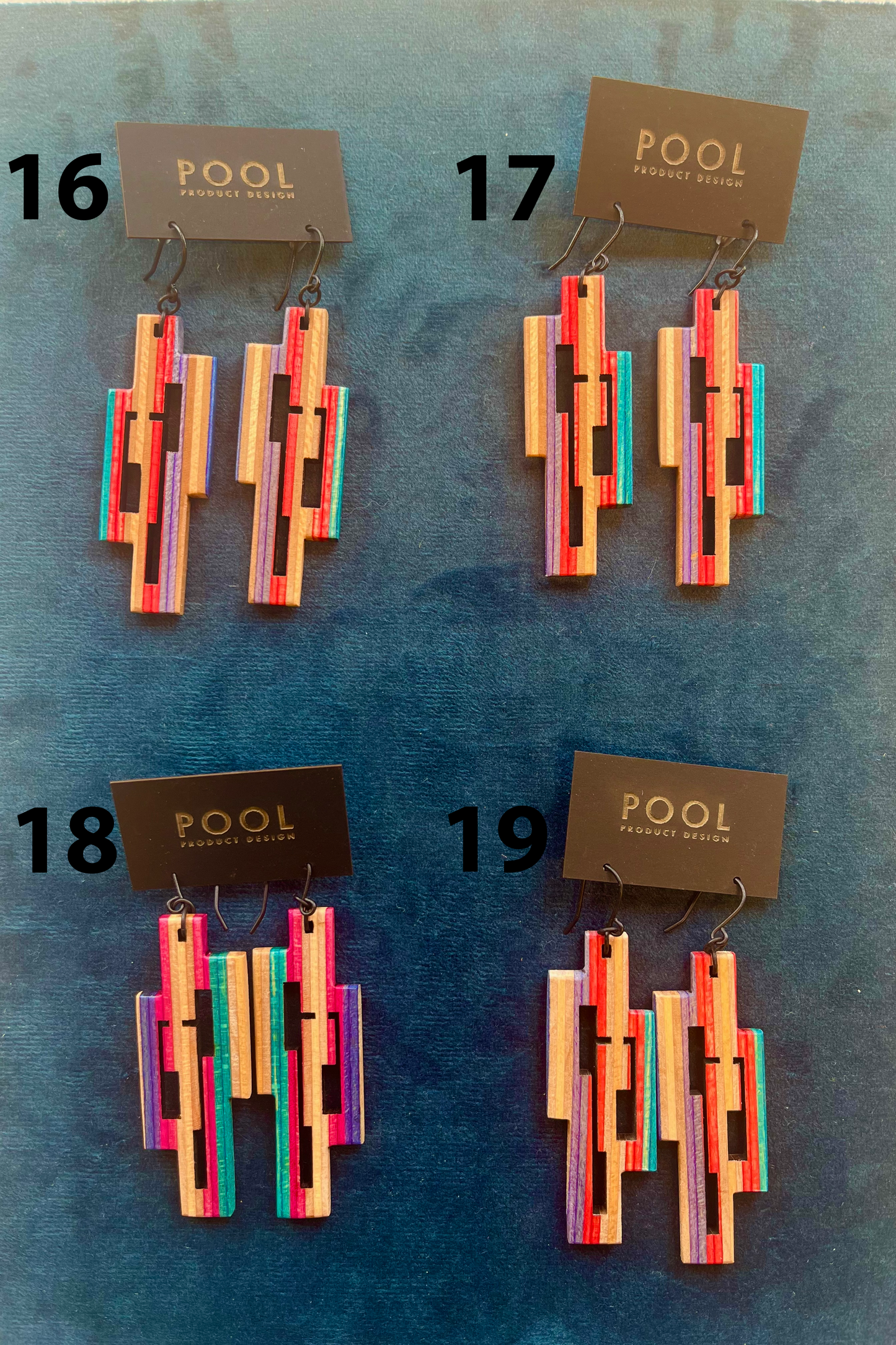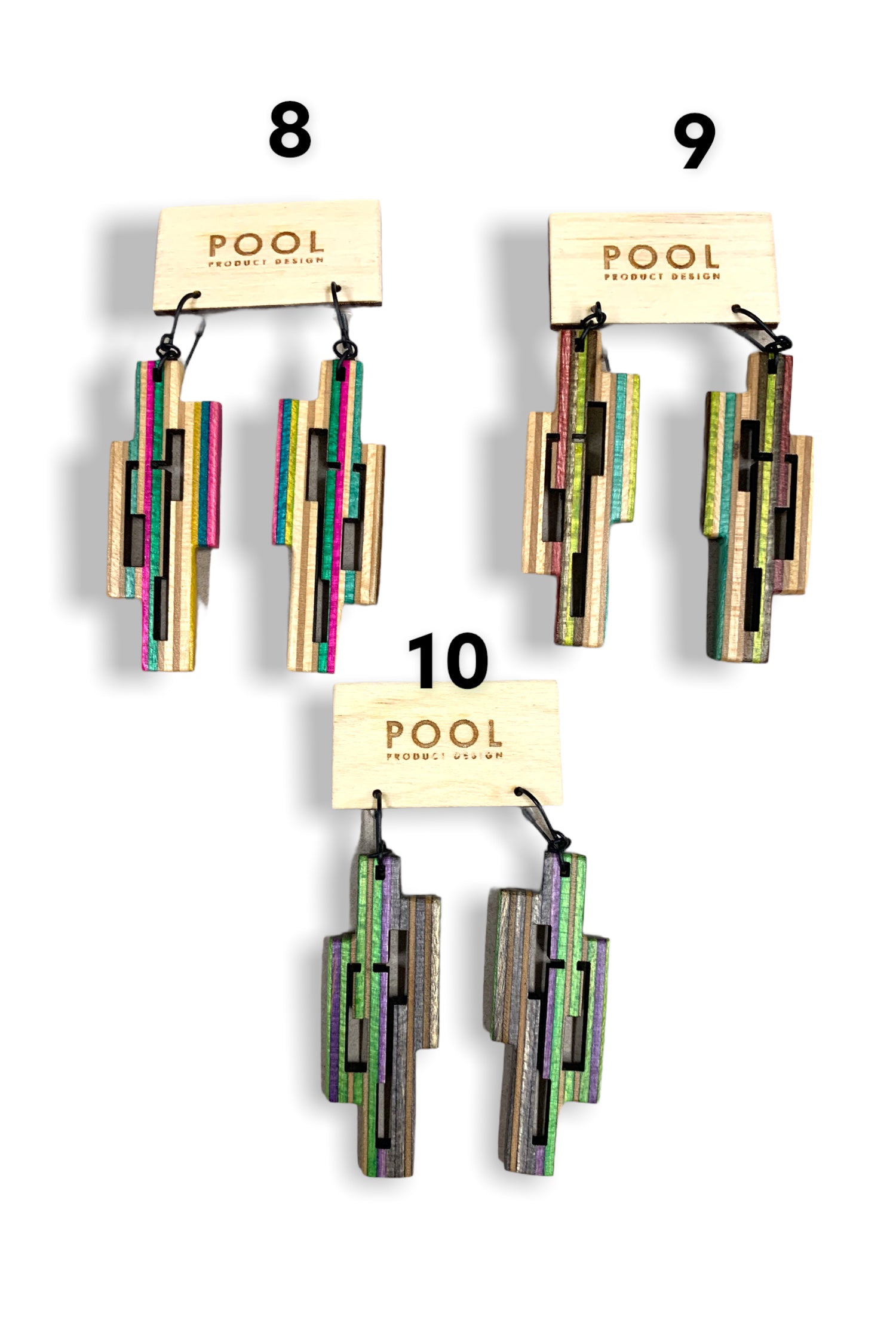 These geometric statement earrings are made from reused skateboards that have been laser cut and carefully sanded by hand. These earrings will add a stylish splash of colour to any wardrobe!