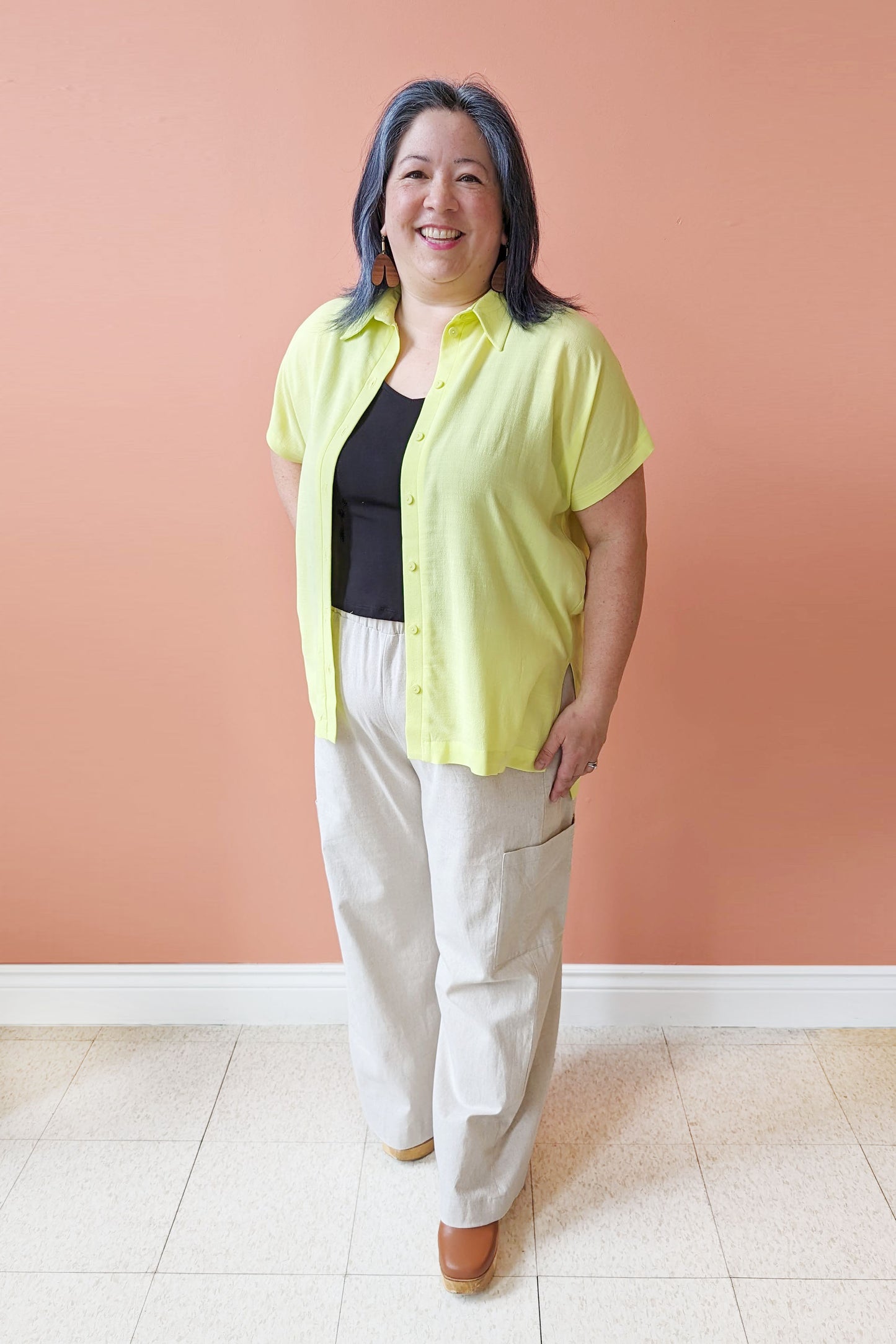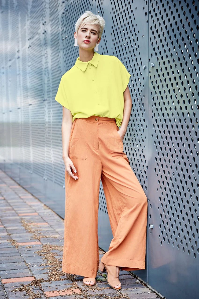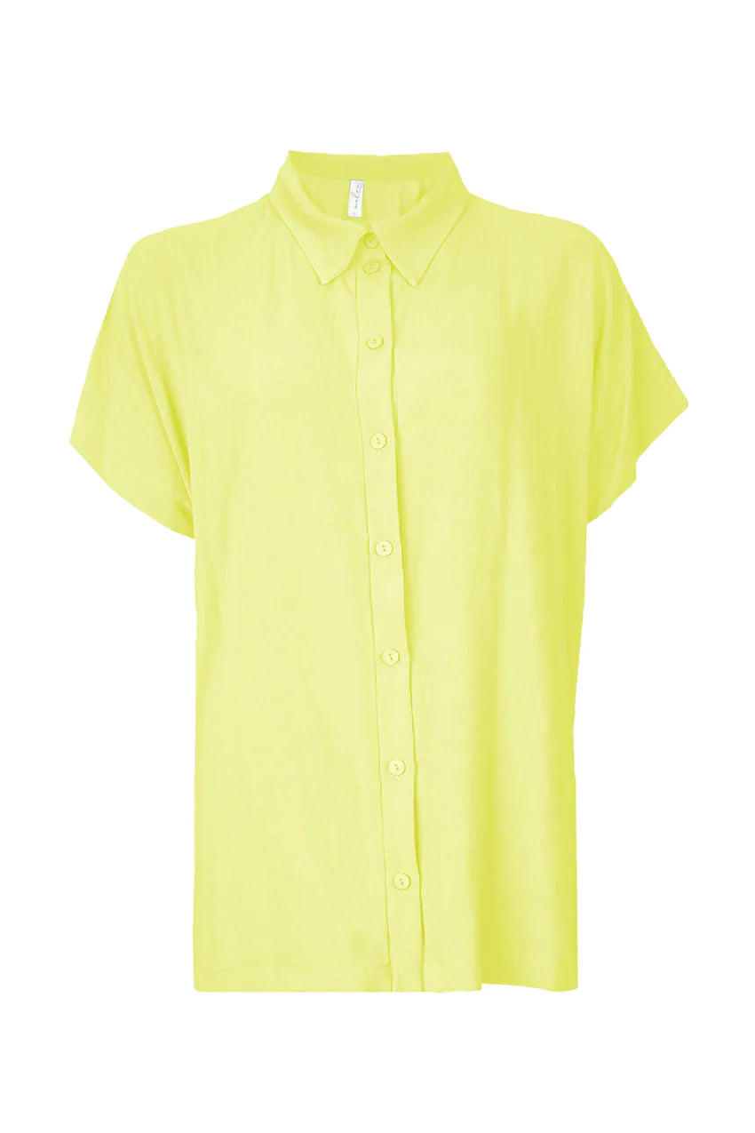 Melow's Iria Shirt was an instant hit with our staff - everyone who tried it on looked amazing in it! This vibrant blouse has short sleeves and a classic collar, with a button front. It has a long length, and is a little shorter in the front than the back. There are small sit details at the sides. Wear it buttoned all the way up, or open over your favourite tanks for a breezy look. It comes in Lemon in sizes XS to XL.
