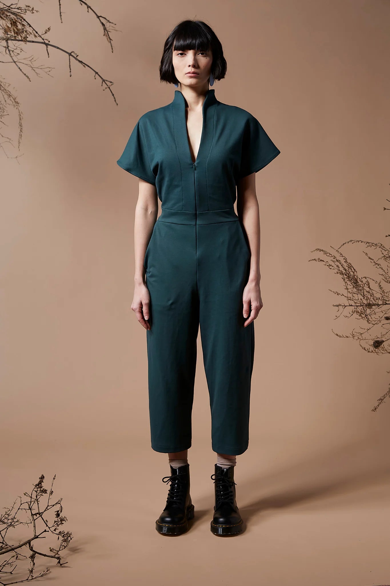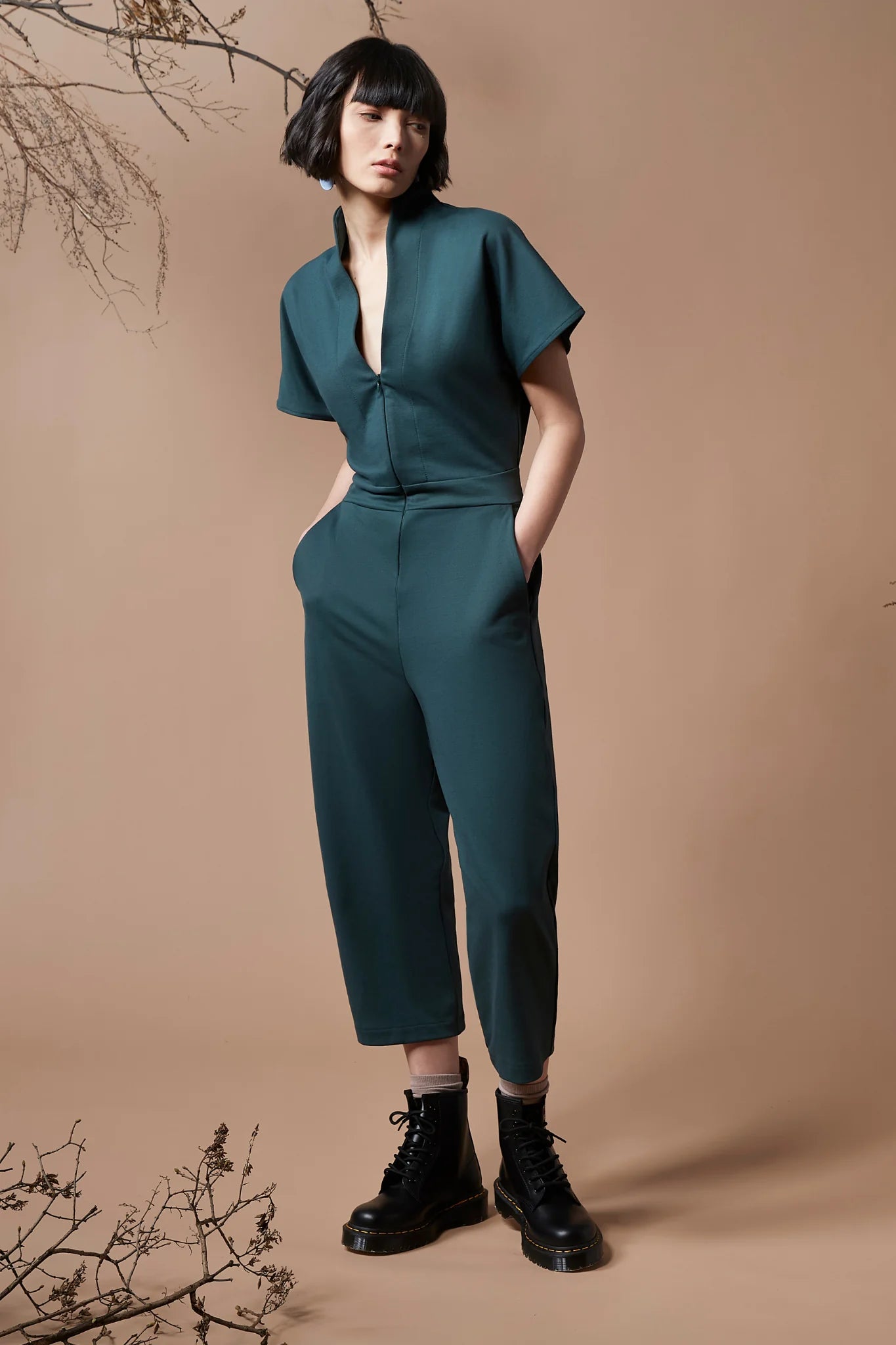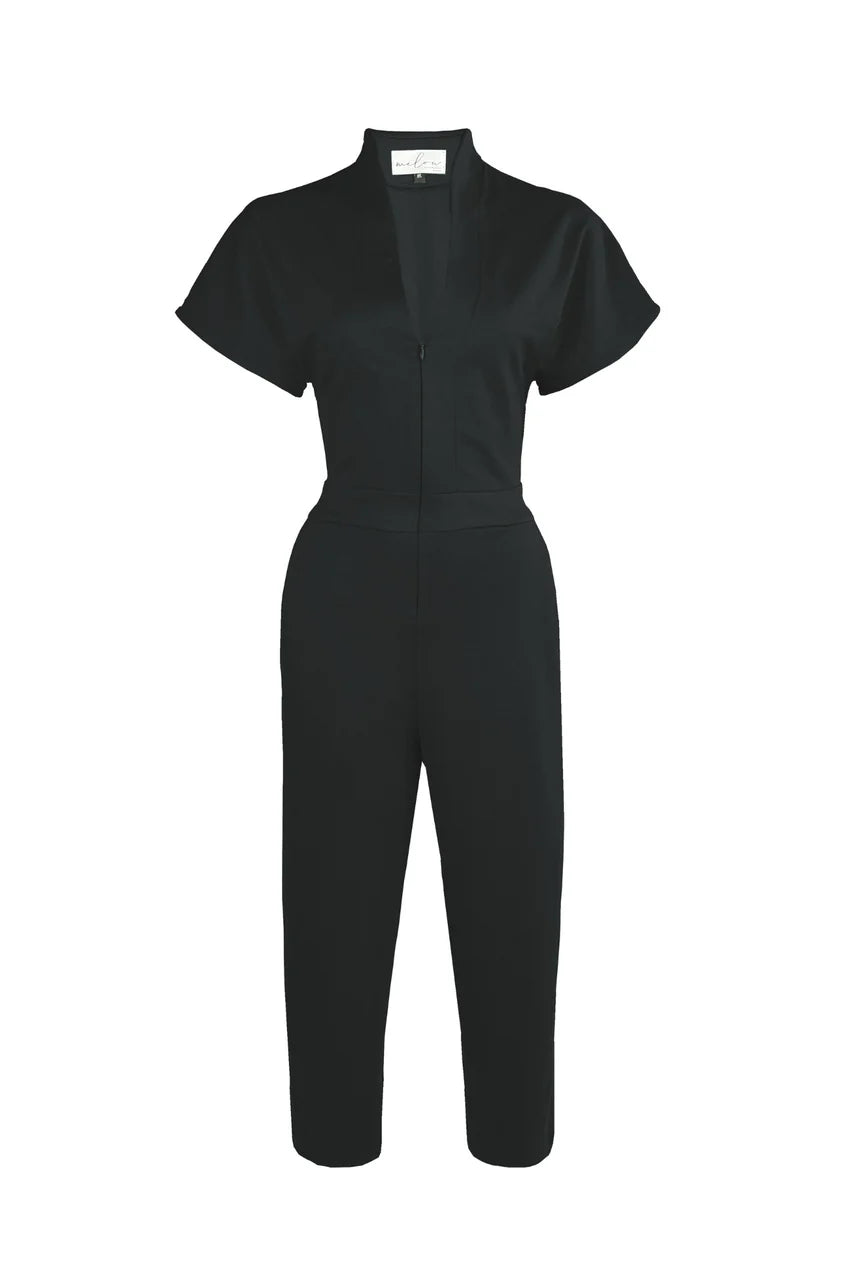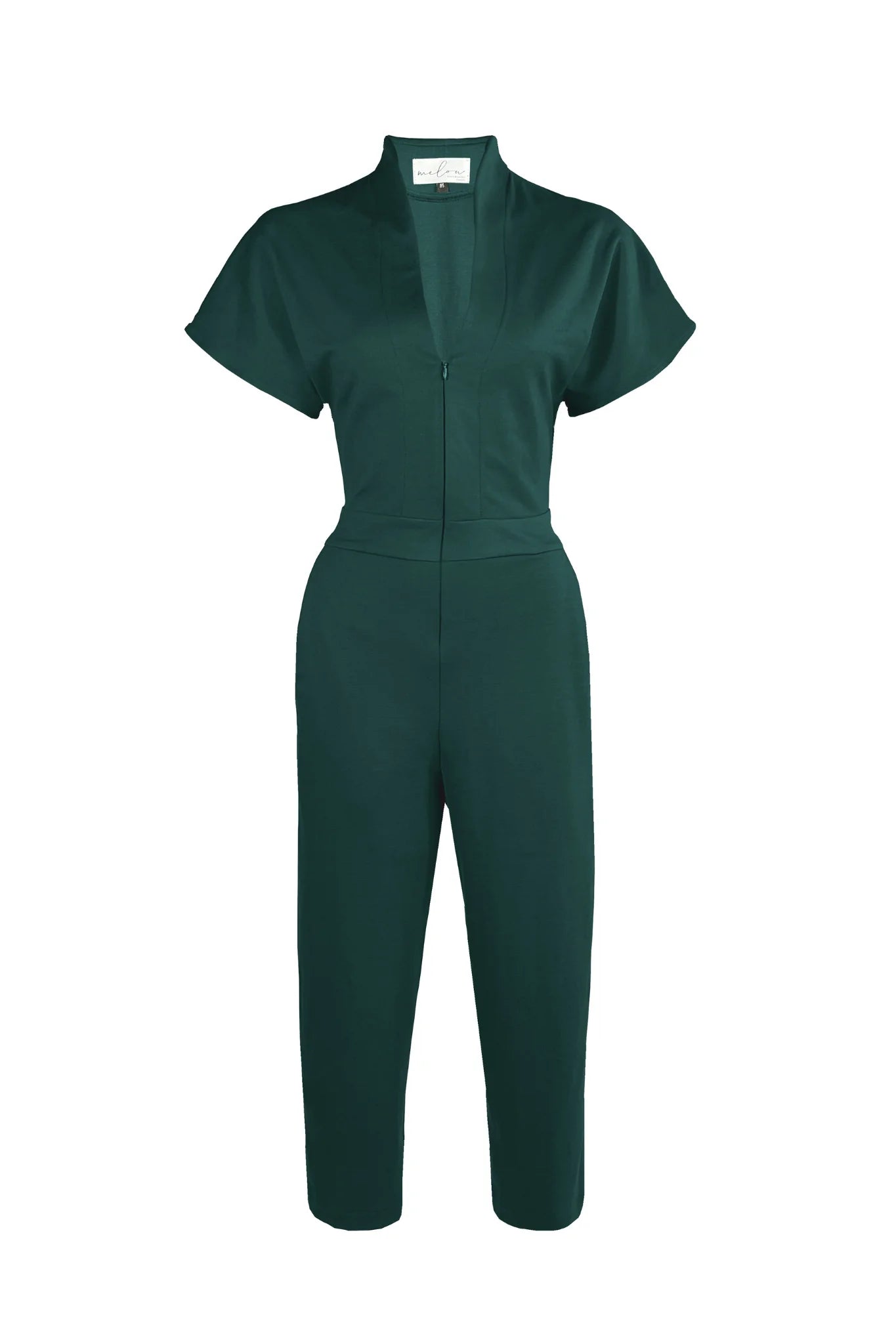 The Jayden Jumpsuit is an updated version of Melow's hit Herby Jumpsuit from last fall, and we love it just as much - if not more! It has the same high collar, plunging V-neckline, and sleek fit, this time with a front zipper! It has short sleeves, a fitted waistband, 7/8 length straight legs, and two side pockets. Available in Black or Forest in sizes XS to XXL.