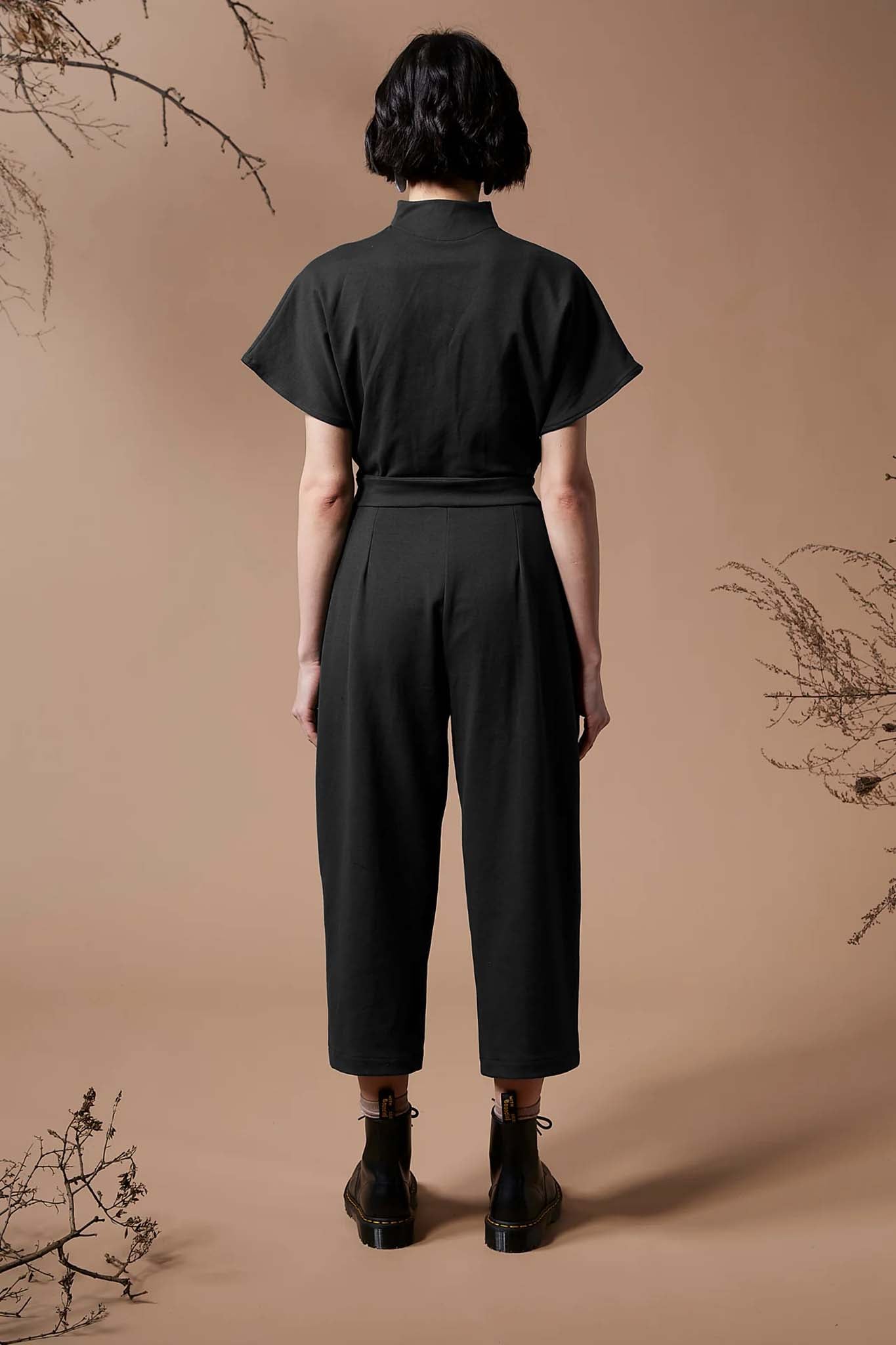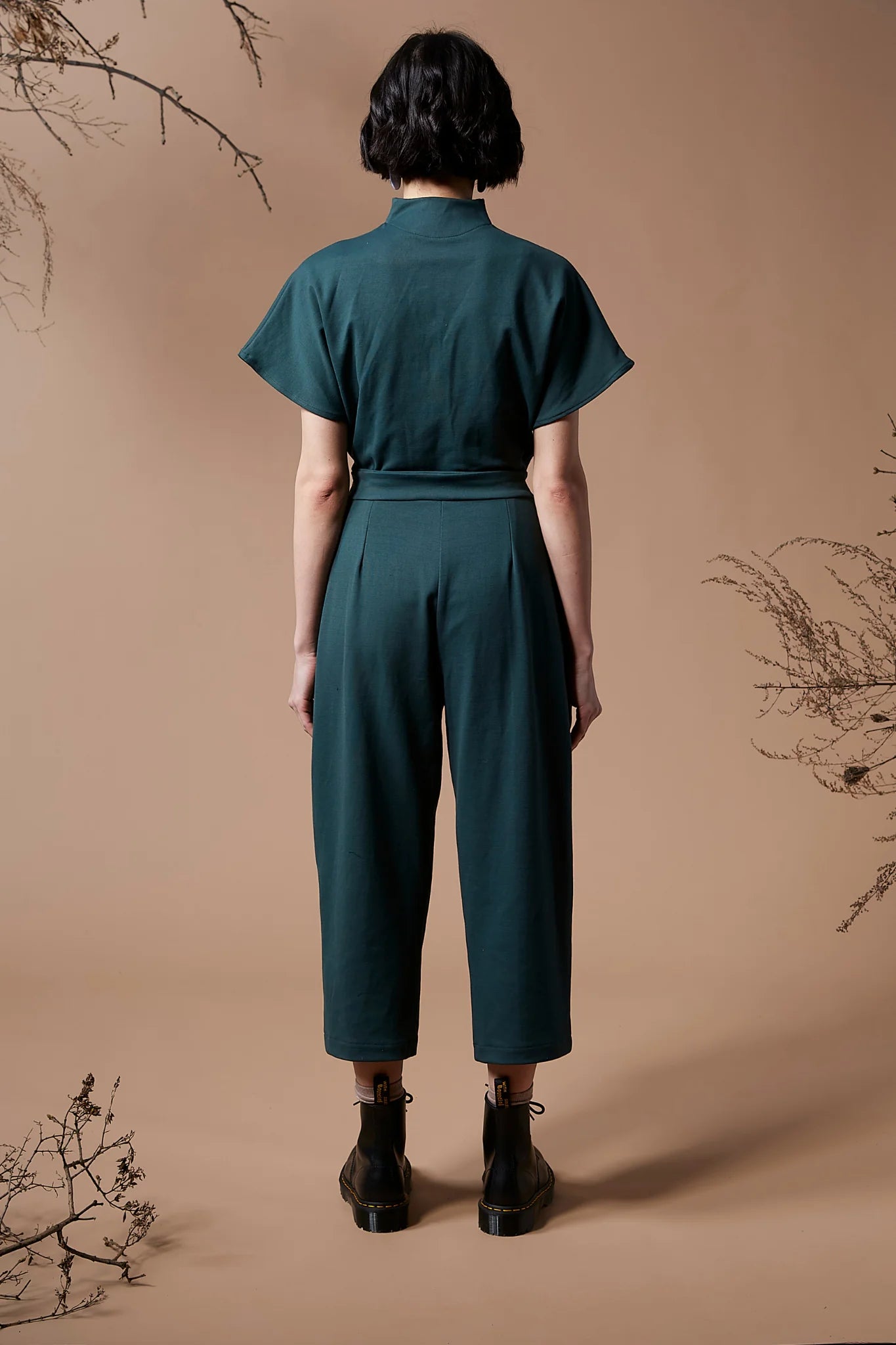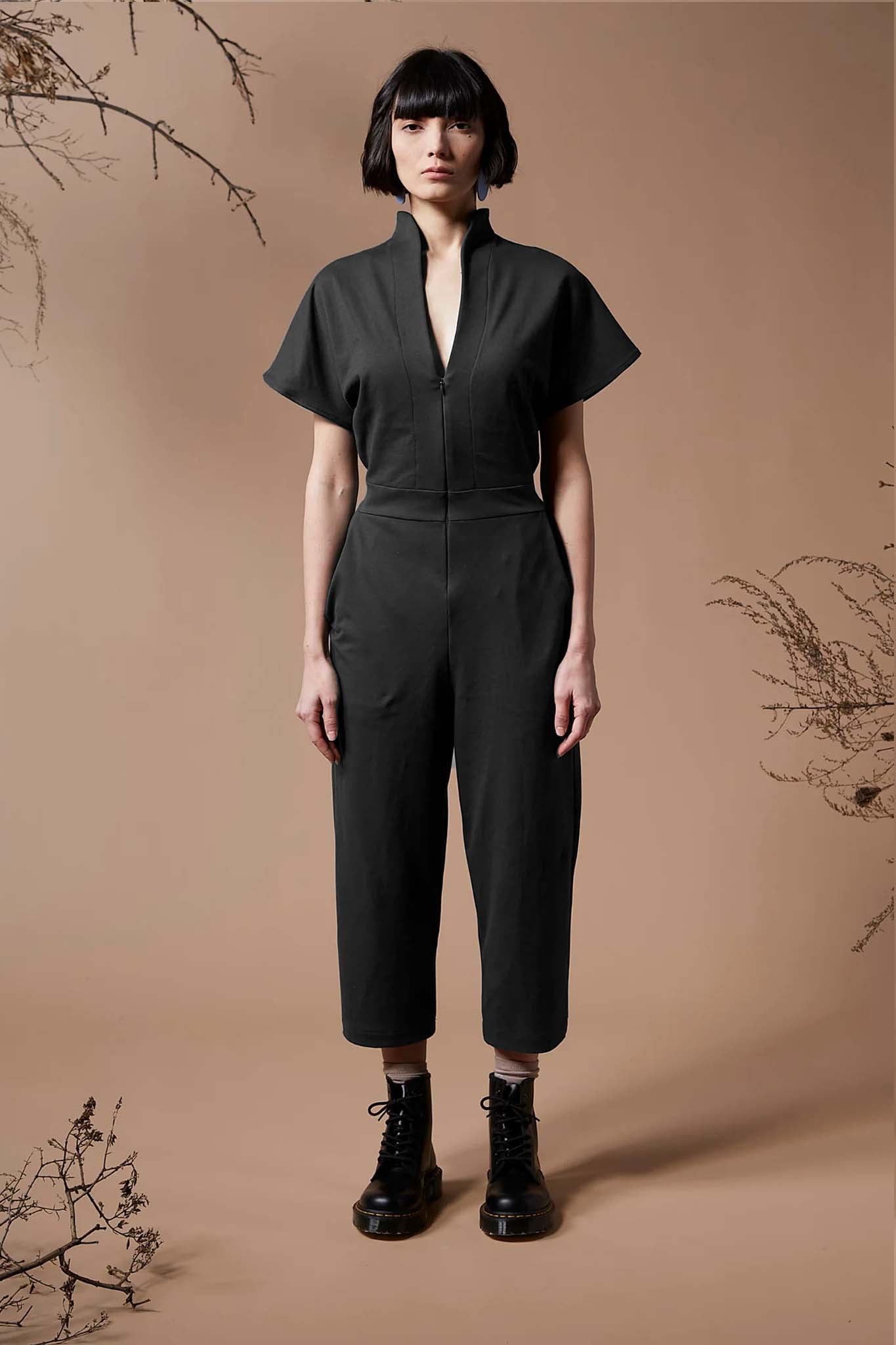 The Jayden Jumpsuit is an updated version of Melow's hit Herby Jumpsuit from last fall, and we love it just as much - if not more! It has the same high collar, plunging V-neckline, and sleek fit, this time with a front zipper! It has short sleeves, a fitted waistband, 7/8 length straight legs, and two side pockets. Available in Black or Forest in sizes XS to XXL.