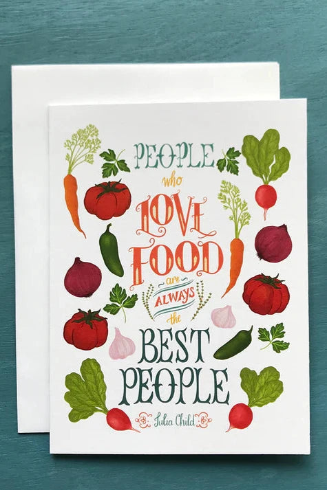 This any-occasion greeting card will delight your foodie friends. The food lover's quote is attributed to culinary legend Julia Child, and the veritable vegetable garden surrounding the hand-lettered phrase on this card is vibrant and eye-catching.