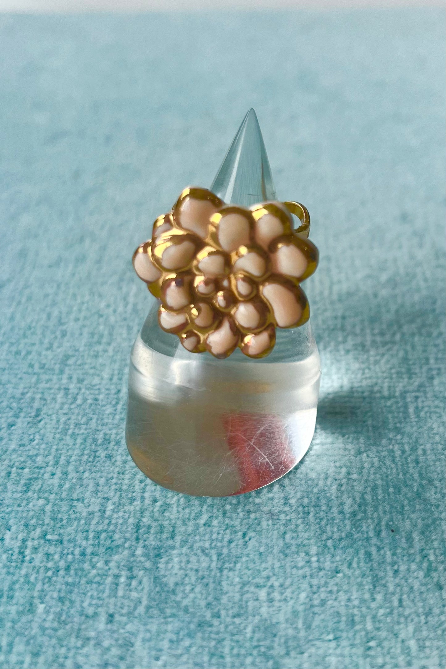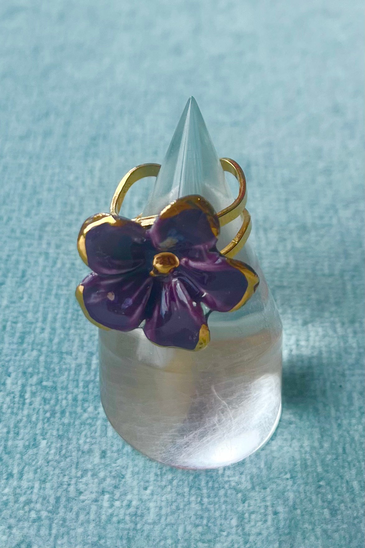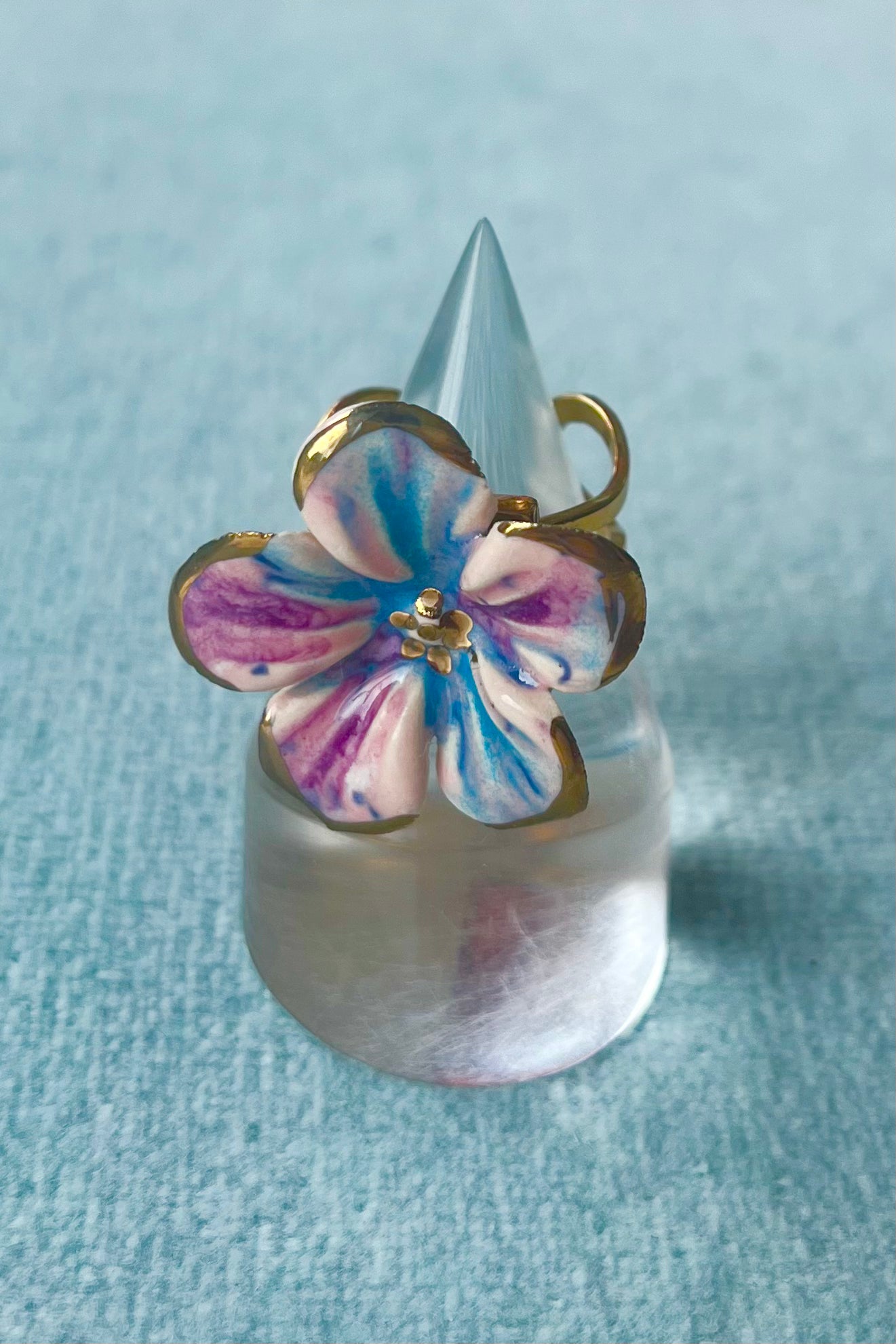 Porcelain glazed pendants with 22K gold detailing. 18K gold plated adjustable rings with stainless steel base.