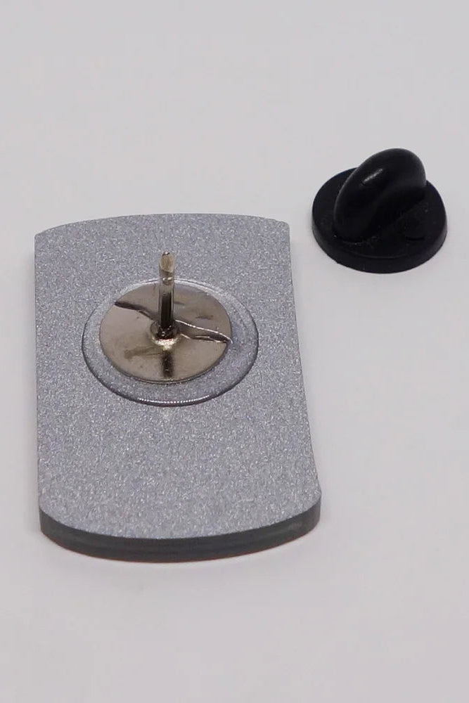 Pin made from recycled clear plastic, laser cut and covered with a digital print.