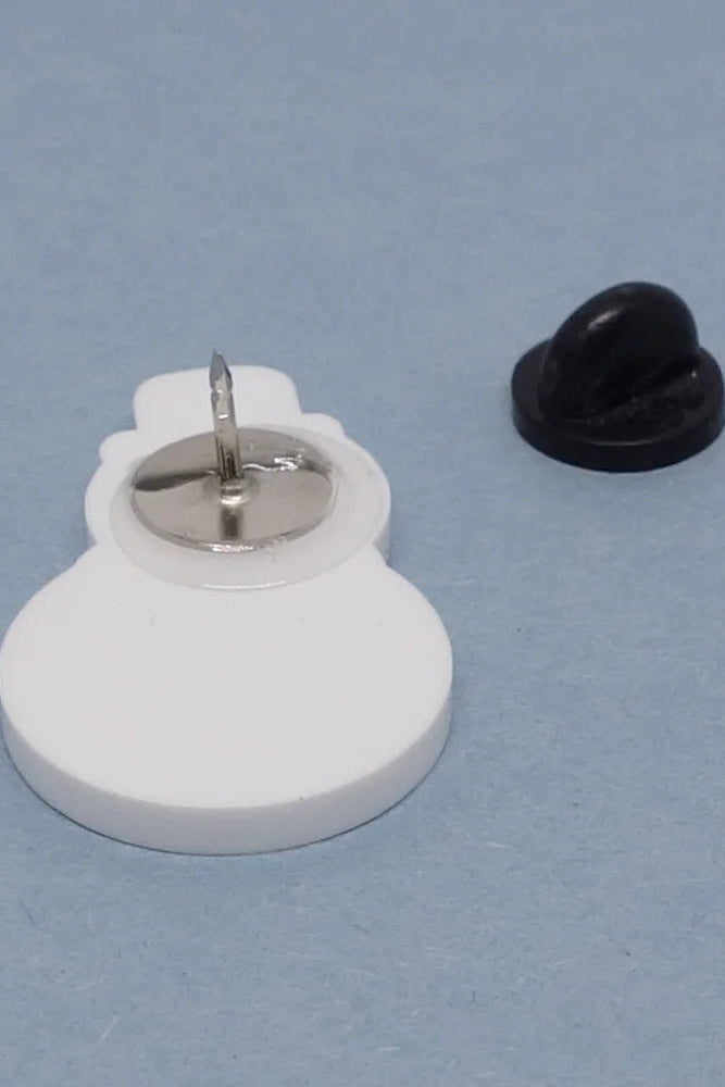 Pin made from reclaimed white plastic, engraved and laser cut. Red and black paint fill.