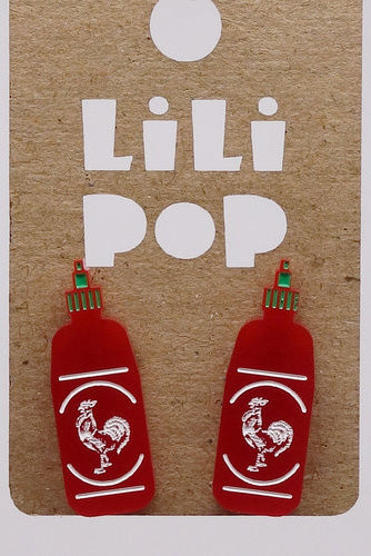 Earrings made from reclaimed red plastic, engraved and laser cut. Filling with white and green paint.
