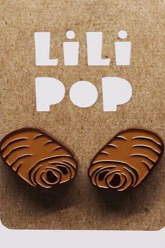 Earrings made from reclaimed gray plastic, engraved and laser cut. Brown and tan paint infill.