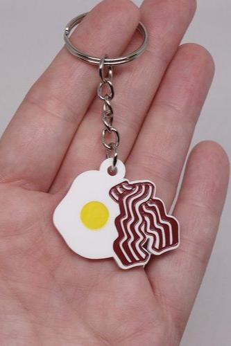 Keychain made from reclaimed white plastic, laser engraved and cut. Yellow and red paint fill.