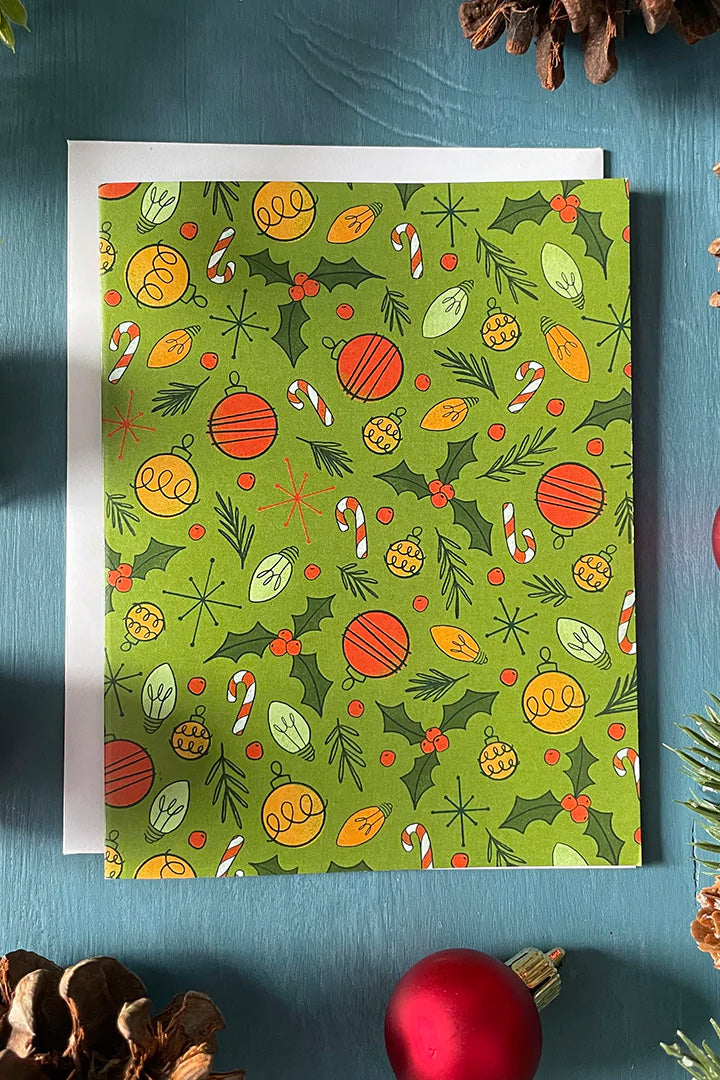 This holiday card is covered in a pattern of midcentury-inspired retro Christmas lights, ornaments and holly on Grinch green - it's perfect for getting into the festive spirit!