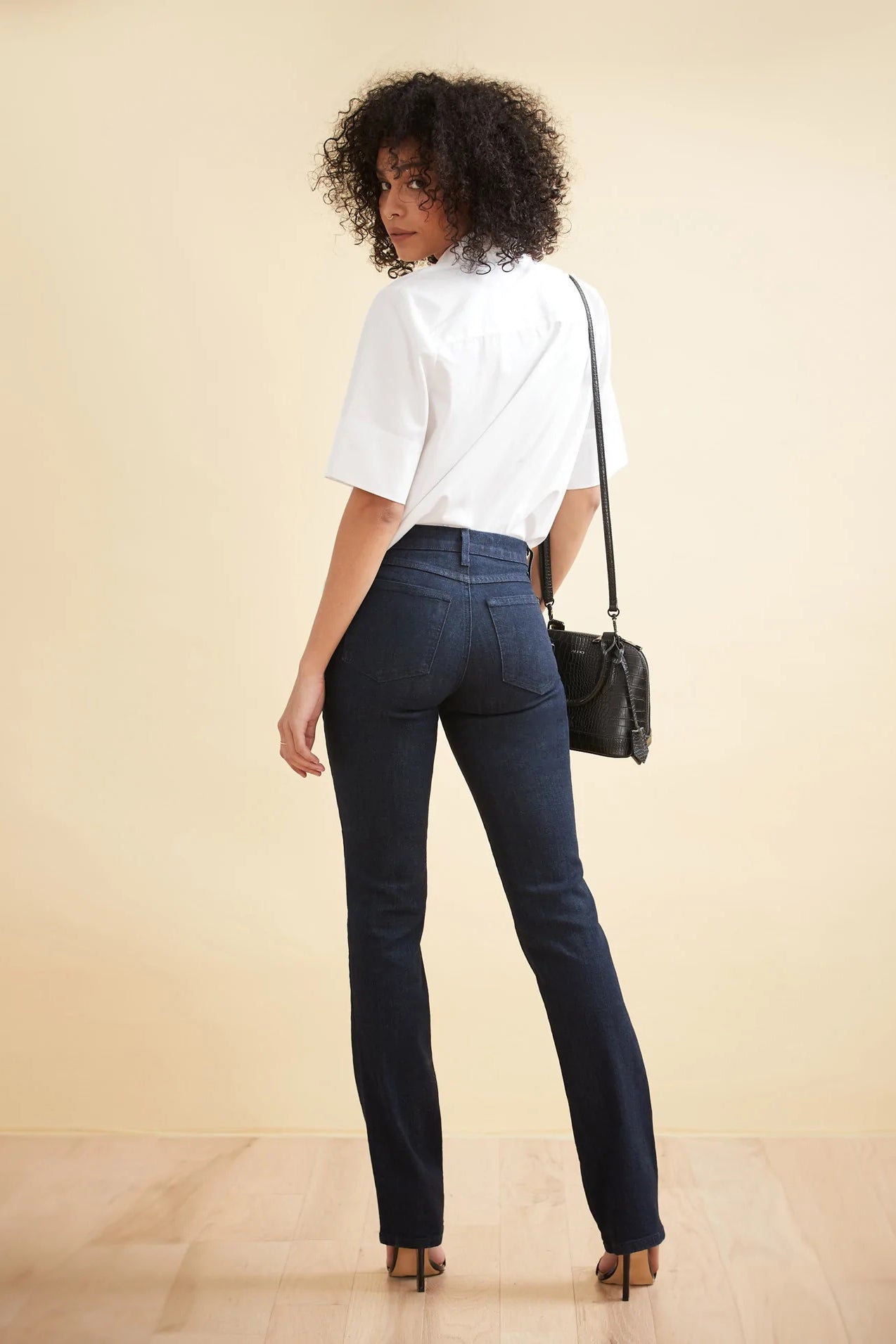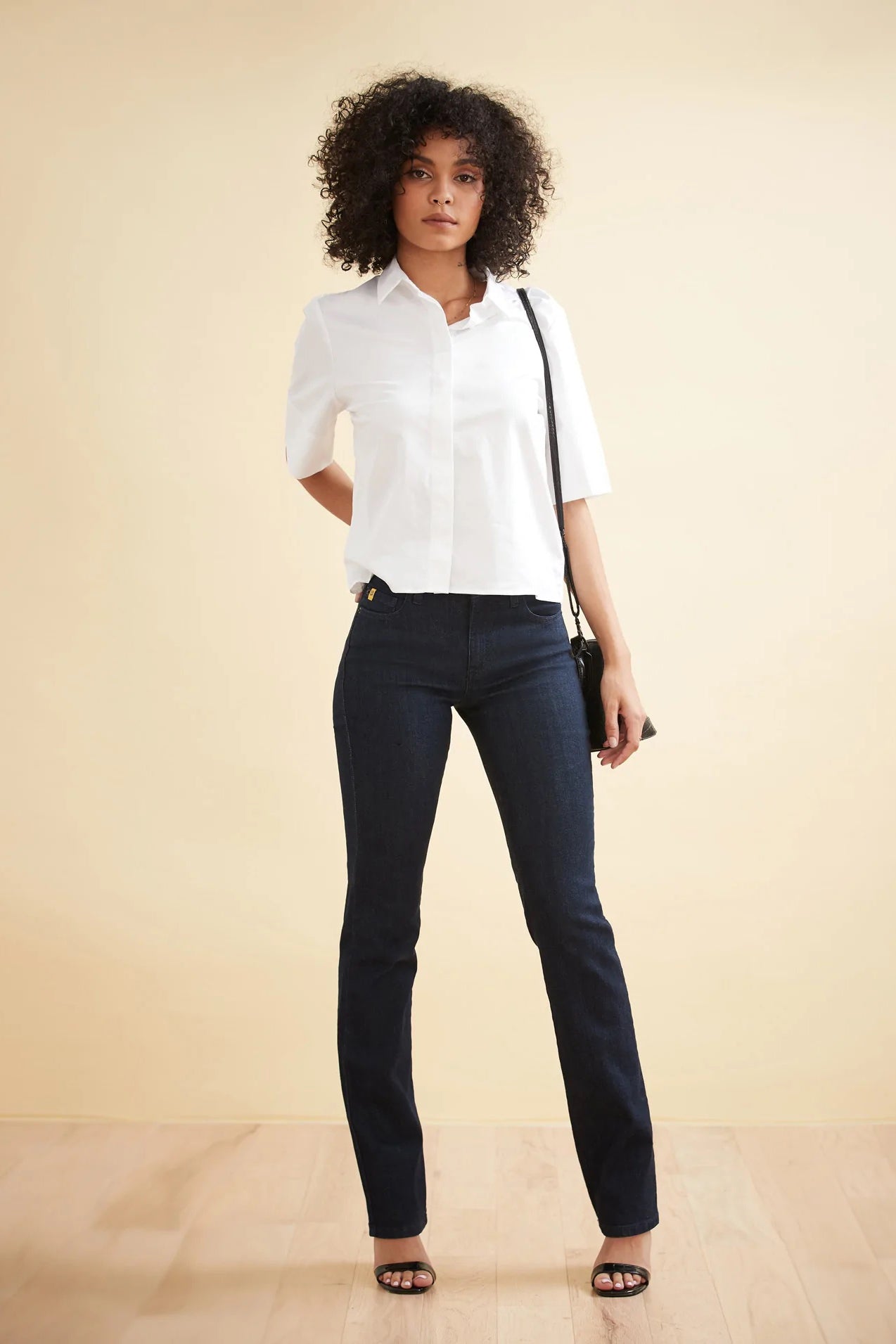 Our classic straight leg silhouette is fitted throughout the hips and straight cut from the knee down. This classic rise jean features a 32" inseam and is in a lovely dark denim blue colour