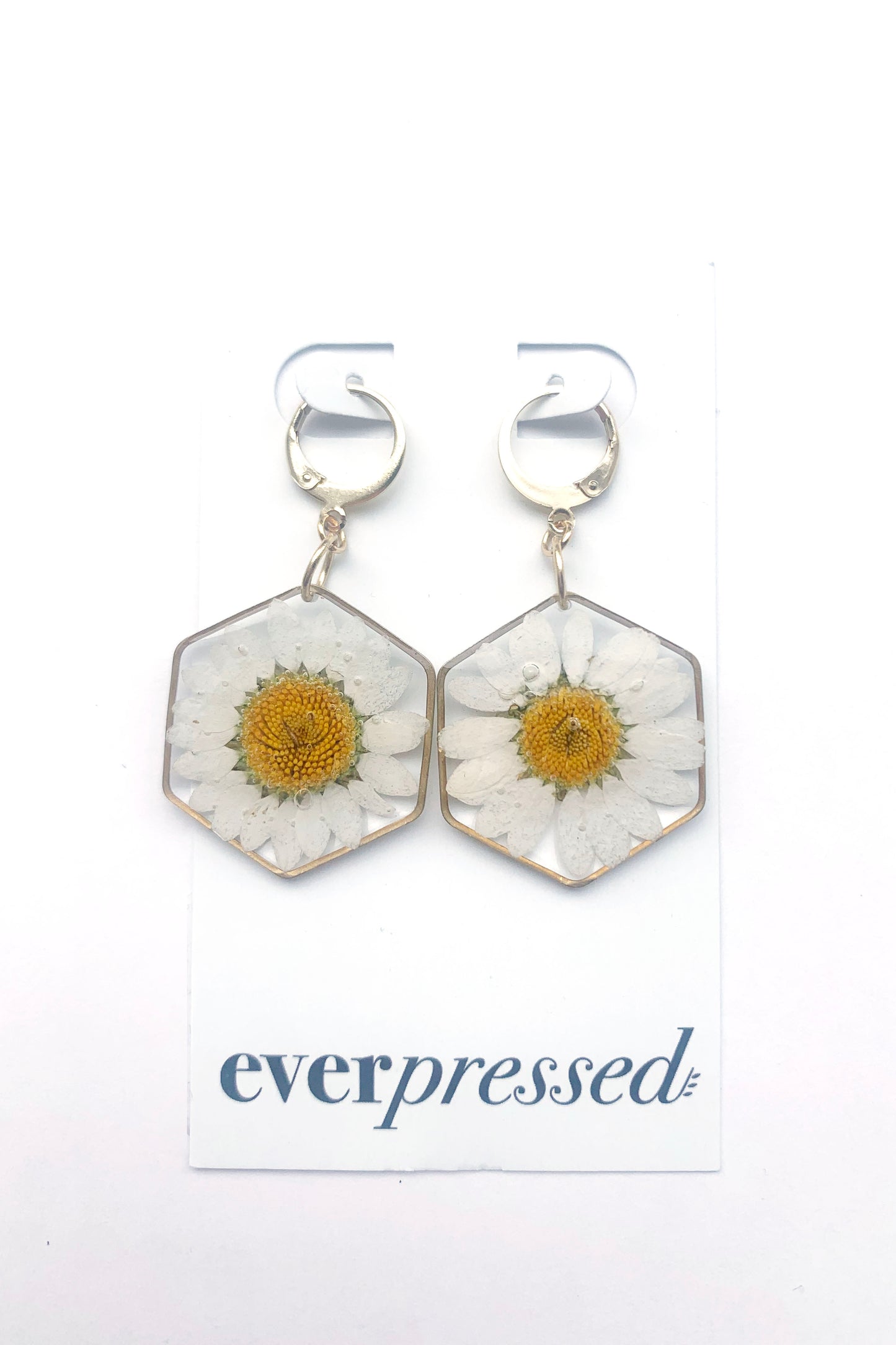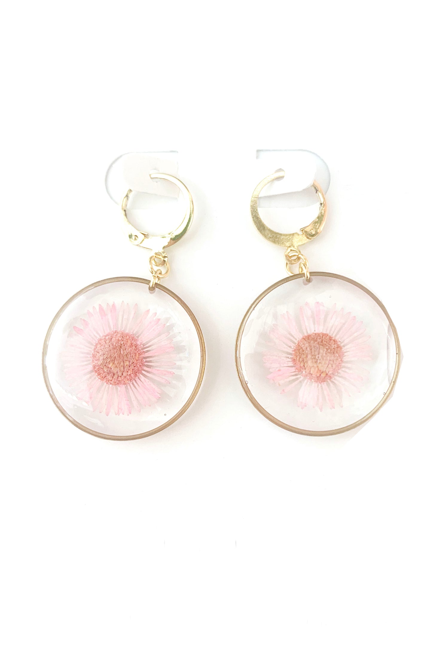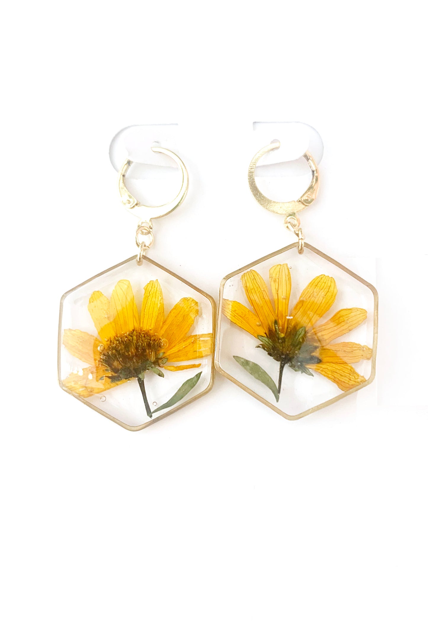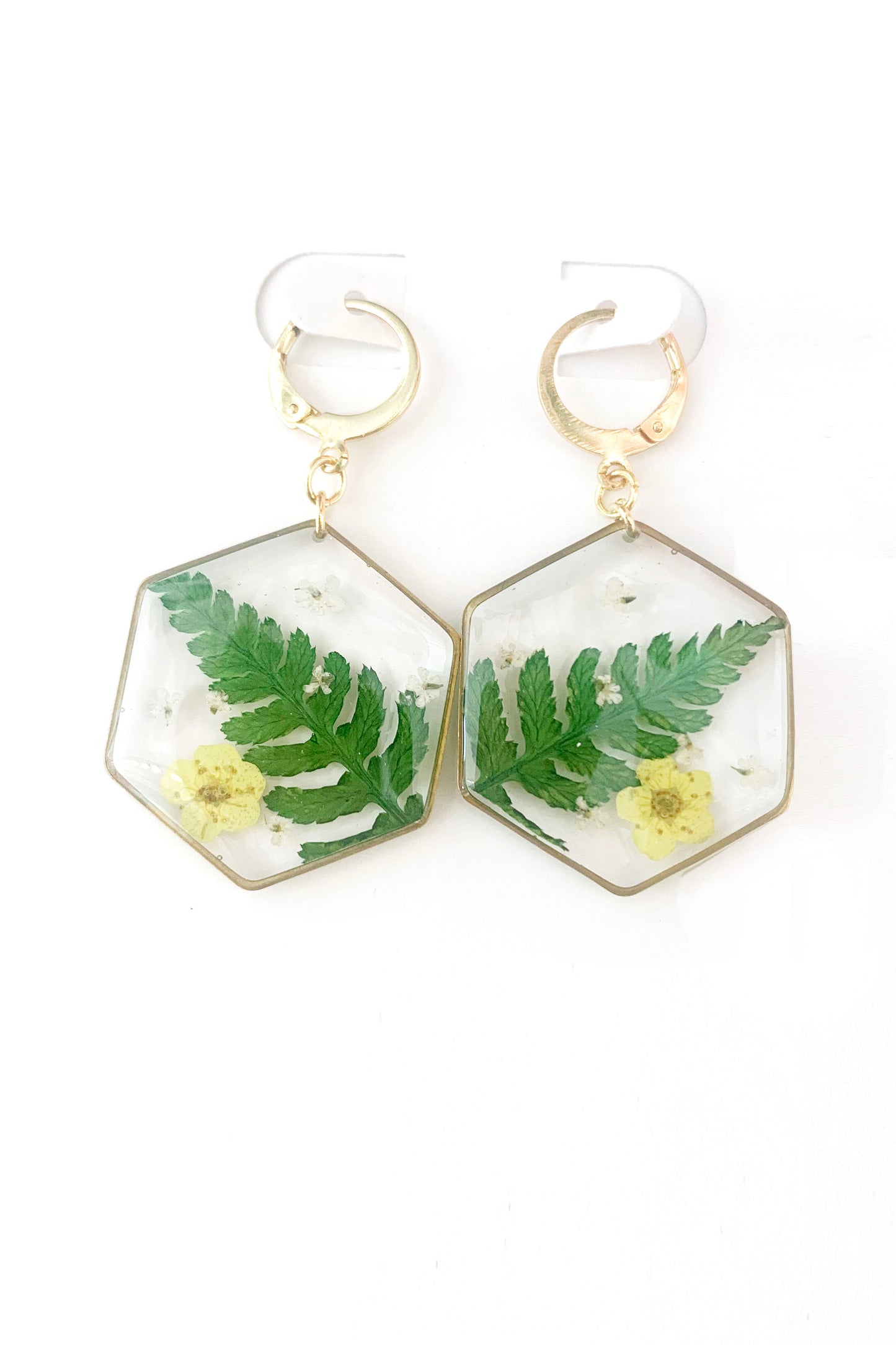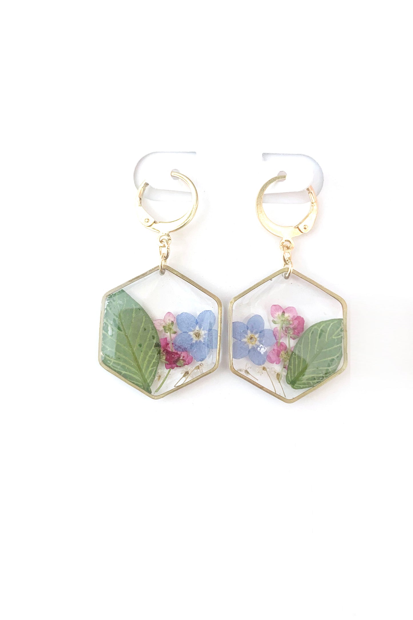 Real pressed flowers and leaves preserved in resin. Hung on gold plated stainless steel leverbacks.