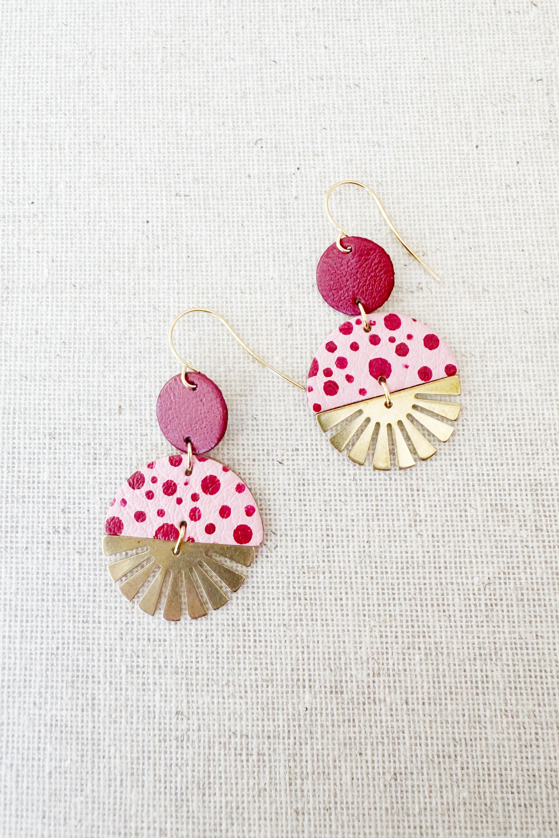 Scandinazn style with a bit of Art Deco influence. Spotted by hand using dotting tools and Angelus Leather Paint.