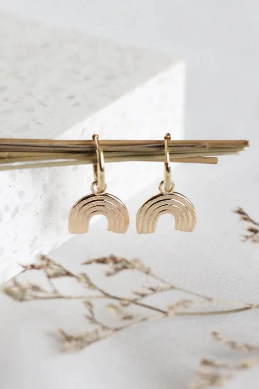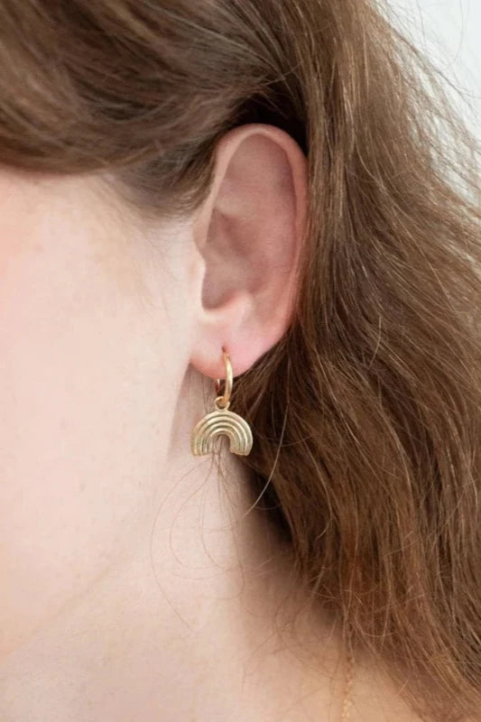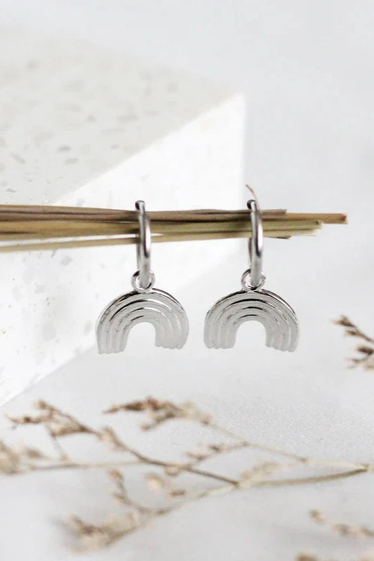An elegant hoop featured an arched rainbow charm. A beautiful piece to carry to wonder of nature and magic of imagination with you wherever you go.