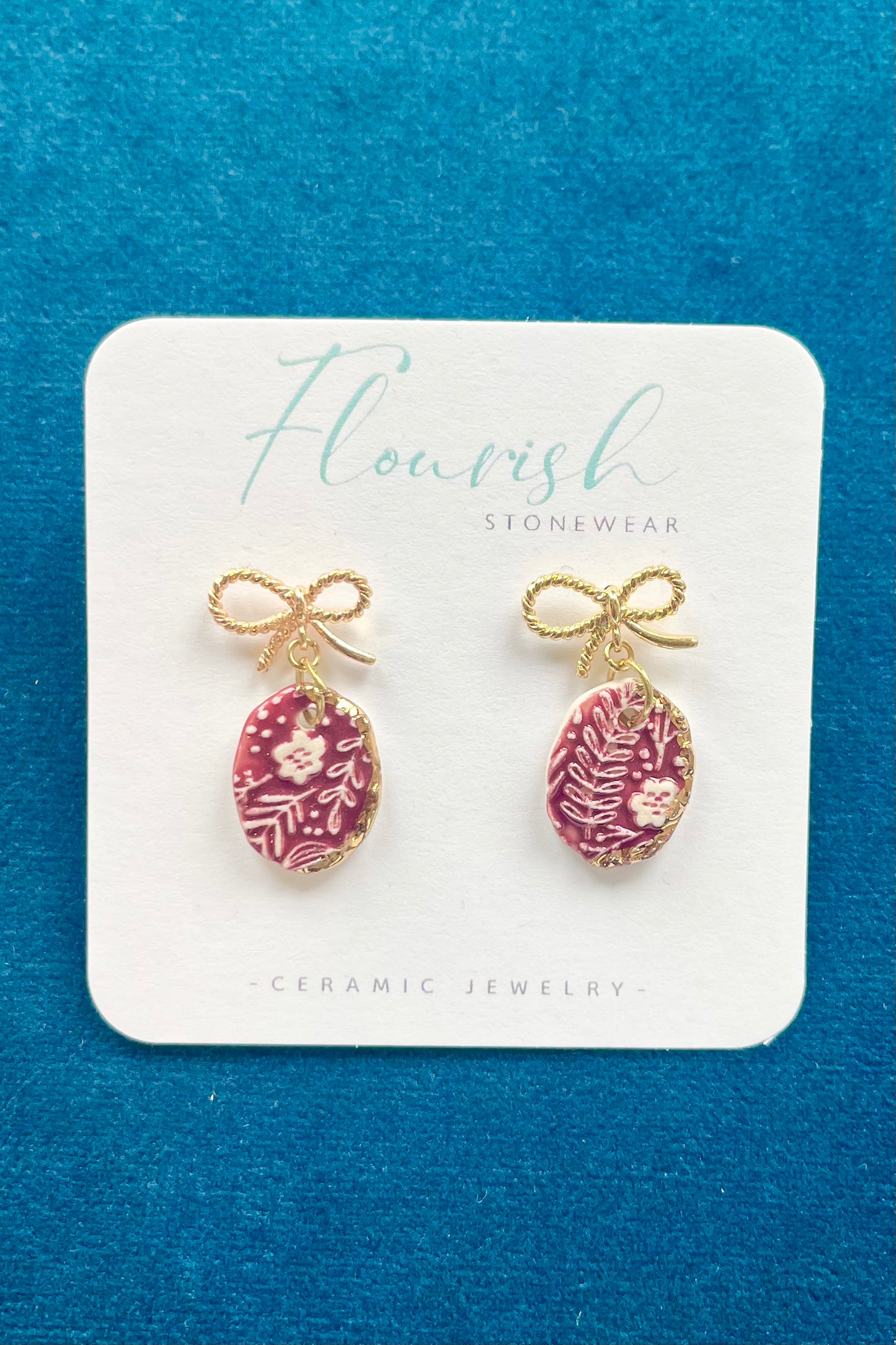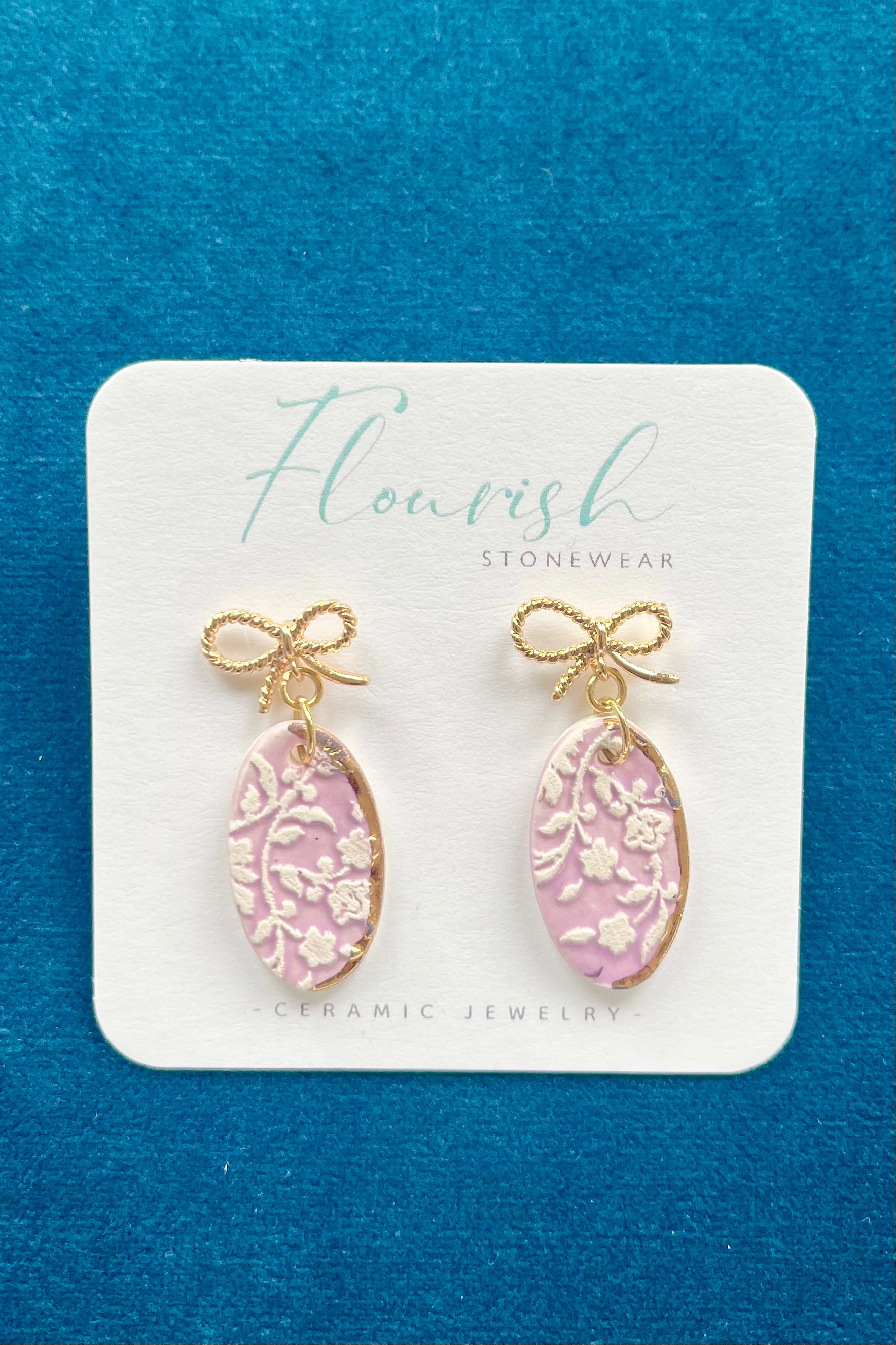 Porcelain imprinted and glazed dangles with 22K gold detailing. 18K gold plated posts. 3 cm.
