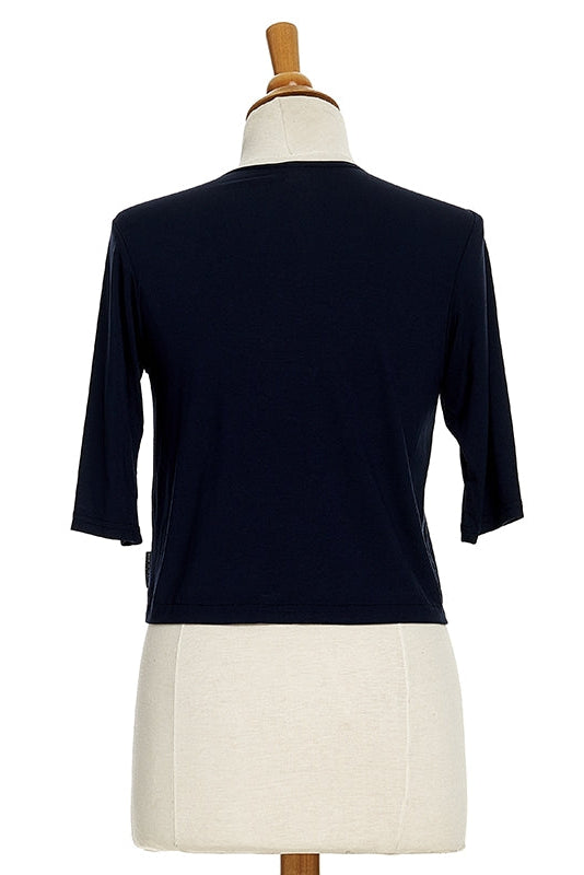 This super soft Rayon bolero can be worn with pretty much anything! Ultra versatile, it has elbow-length sleeves and slightly angled front panels. It comes in Black, Navy or White in sizes XS to XXL.