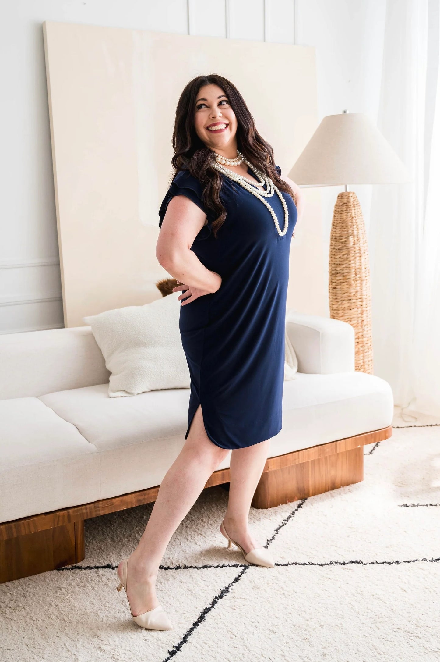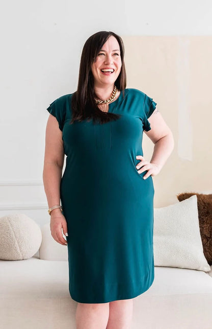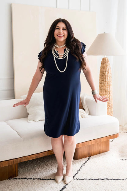 Dotty's Sheath Dress features a timeless cut with some fun touches! It has double ruffle short sleeves and banded side slits at the hem. Its notched V-neckline adds a flirty touch, while the wrinkle-free, stretchy matte jersey fabric ensures comfort and ease all day long. It hits at the knee. Available in Navy in sizes XS to XL.