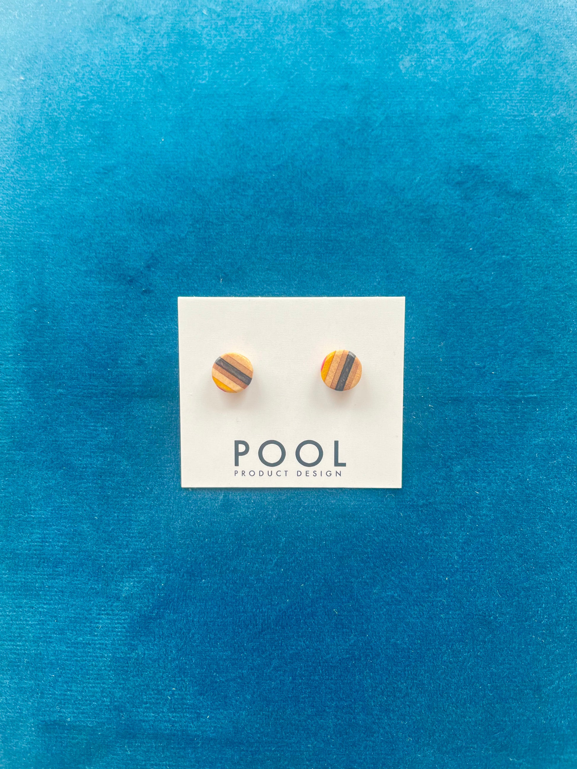 These small round stud earrings are made from repurposed skateboards that get new life in the form of geometric and colourful jewelry pieces.
