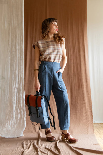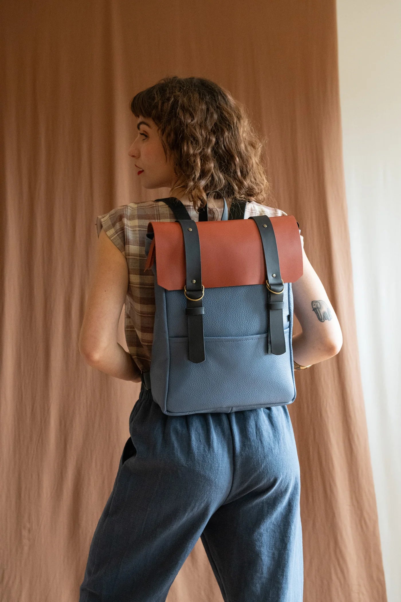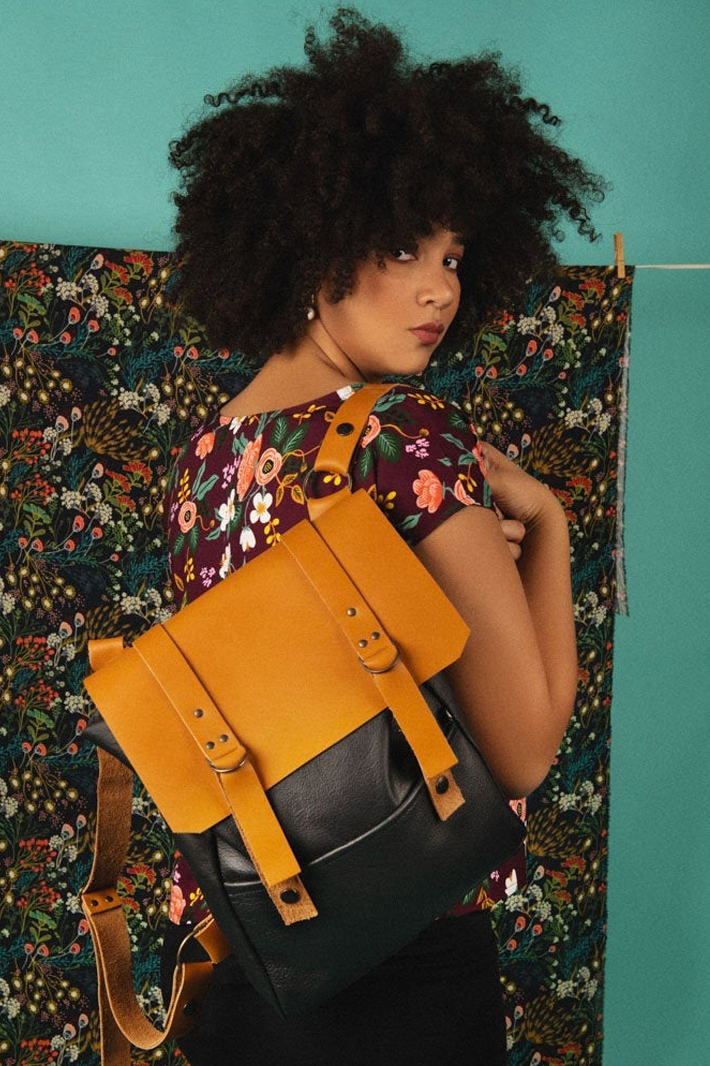 Additionally, the backpack can put the shoulder through its system snaps on the straps. It has an open pocket in front and a closed bag with zipper back. The inside is lined with a recycled fabric and there is an open pocket.
