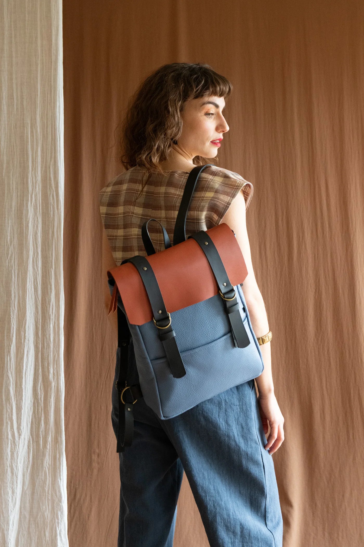 Backpack made of 100% leather. It closes with a clasp and two snaps. Its capacity can be larger or smaller as needed with its two loops in front that are settled. You can get your laptop or tighten the straps so you do not need a large container.