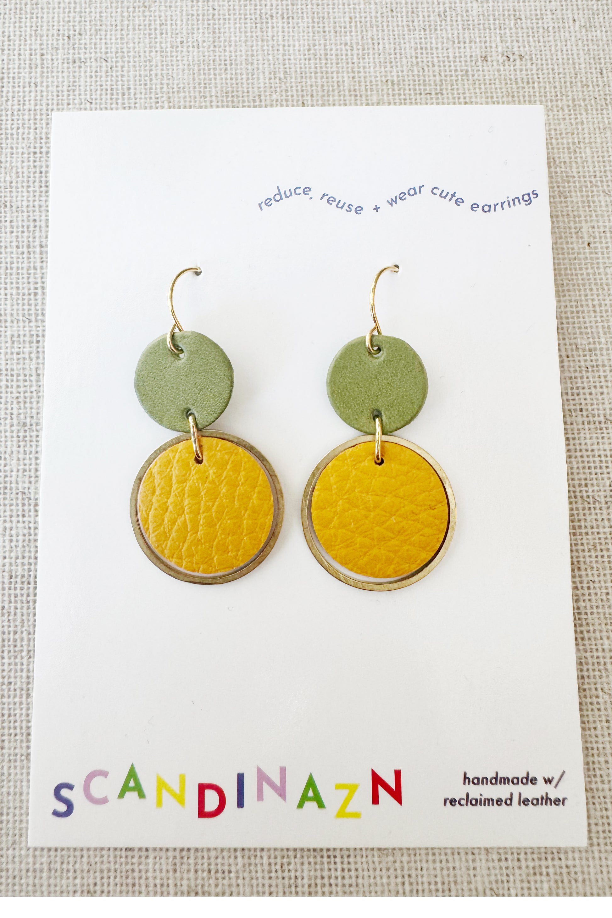 The classic Orbit Earrings - two leather circles, orbited by a brass ring. This punchy colour combination is bright, juicy and very eye-catching.